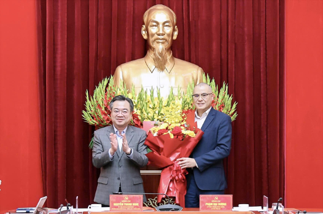 Đồng chí Trưởng Ban Chính sách, chiến lược Trung ương Nguyễn Thanh Nghị tặng hoa chúc mừng đồng chí Phạm Đại Dương được Bộ Chính trị điều động, chỉ định giữ chức Bí thư Tỉnh ủy Phú Thọ nhiệm kỳ 2025-2030 (Nguồn: Báo Phú Thọ).