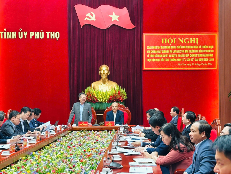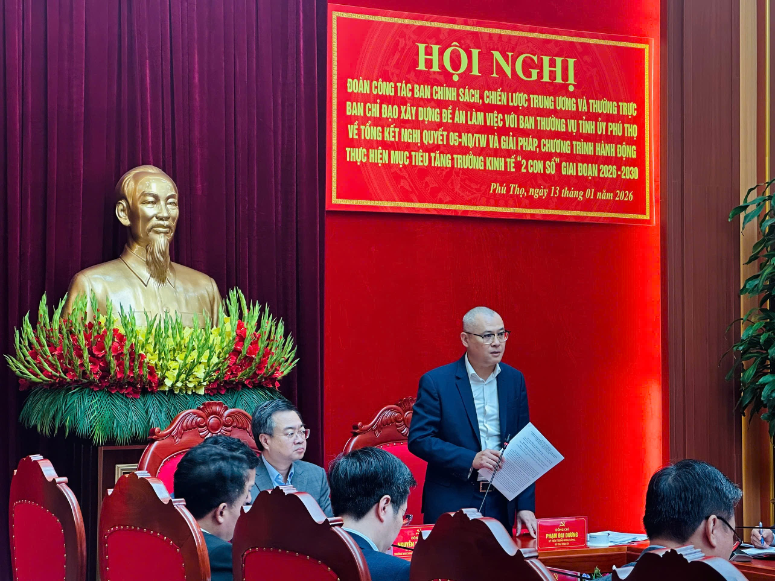 Phát biểu tại buổi làm việc, đồng chí Bí thư Tỉnh ủy Phạm Đại Dương khẳng định mục tiêu tăng trưởng kinh tế hai con số là nhiệm vụ chính trị trọng tâm, thể hiện khát vọng đưa Phú Thọ cùng cả nước bước vào “kỷ nguyên vươn mình của dân tộc”. Tỉnh đặt mục tiêu nâng tỷ trọng công nghiệp lên 55%, đẩy mạnh kinh tế số thông qua phát triển nhà máy, trang trại thông minh và hạ tầng công nghệ. Bí thư Tỉnh ủy cam kết tiếp thu nghiêm túc các ý kiến góp ý của đoàn công tác, đồng thời mong muốn Ban Chính sách, chiến lược Trung ương tiếp tục đồng hành lâu dài cùng địa phương.