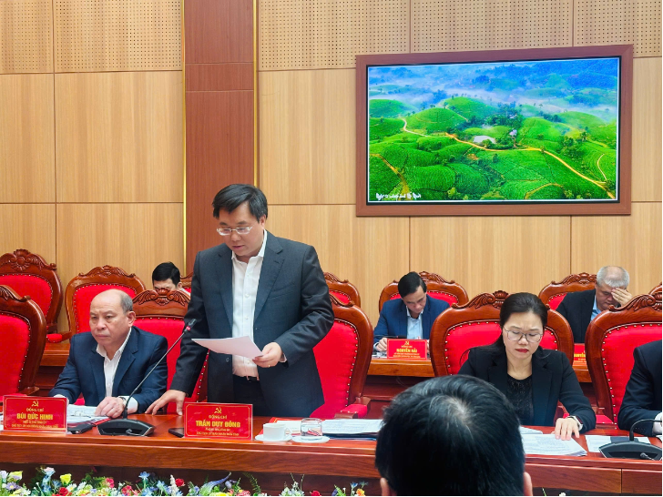 Tại hội nghị, đồng chí Phó Bí thư Tỉnh ủy, Chủ tịch UBND tỉnh Trần Duy Đông đã thay mặt Ban Thường vụ Tỉnh ủy Phú Thọ, báo cáo với Đoàn công tác về tình hình, kết quả thực hiện Nghị quyết số 05-NQ/TW, ngày 1/11/2016 của Ban Chấp hành Trung ương Đảng khóa XII về một số chủ trương, chính sách lớn nhằm tiếp tục đổi mới mô hình tăng trưởng, nâng cao chất lượng tăng trưởng, năng suất lao động, sức cạnh tranh của nền kinh tế; các giải pháp chiến lược và Chương trình hành động của Tỉnh ủy để thúc đẩy tăng trưởng kinh tế “2 con số” cũng như tình hình phát triển kinh tế - xã hội của tỉnh trong với nhiều kết quả nổi bật. Tốc độ tăng trưởng kinh tế của tỉnh năm 2025 đạt 10,52%, đứng thứ nhất vùng Trung du và miền núi phía Bắc và đứng thứ 4 cả nước. Quy mô GRDP theo giá hiện hành đạt 412,4 nghìn tỷ đồng, xếp thứ 6 toàn quốc. Tổng thu ngân sách Nhà nước trên địa bàn năm 2025 đạt 61,7 nghìn tỷ đồng, tăng 47% so với năm 2024.