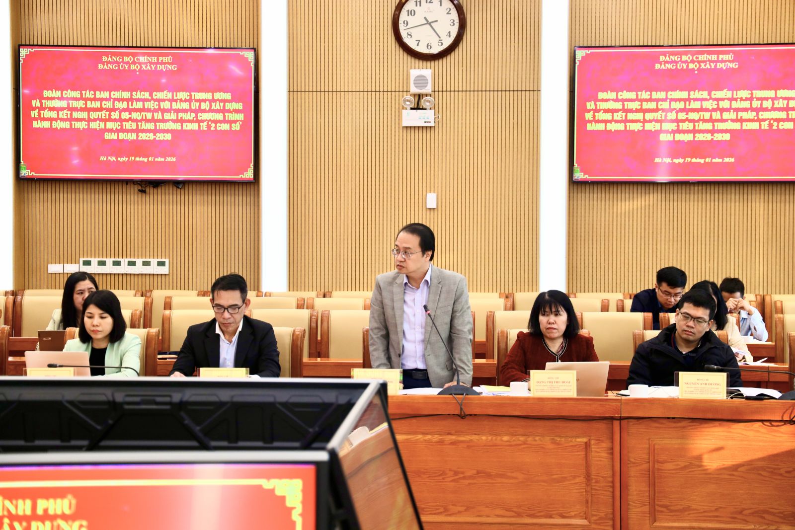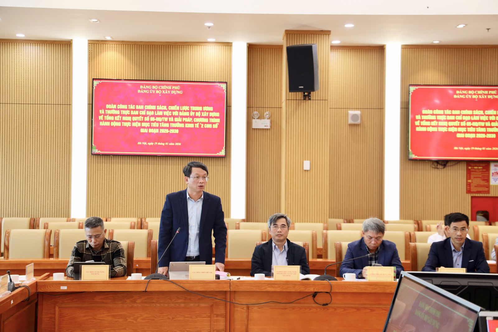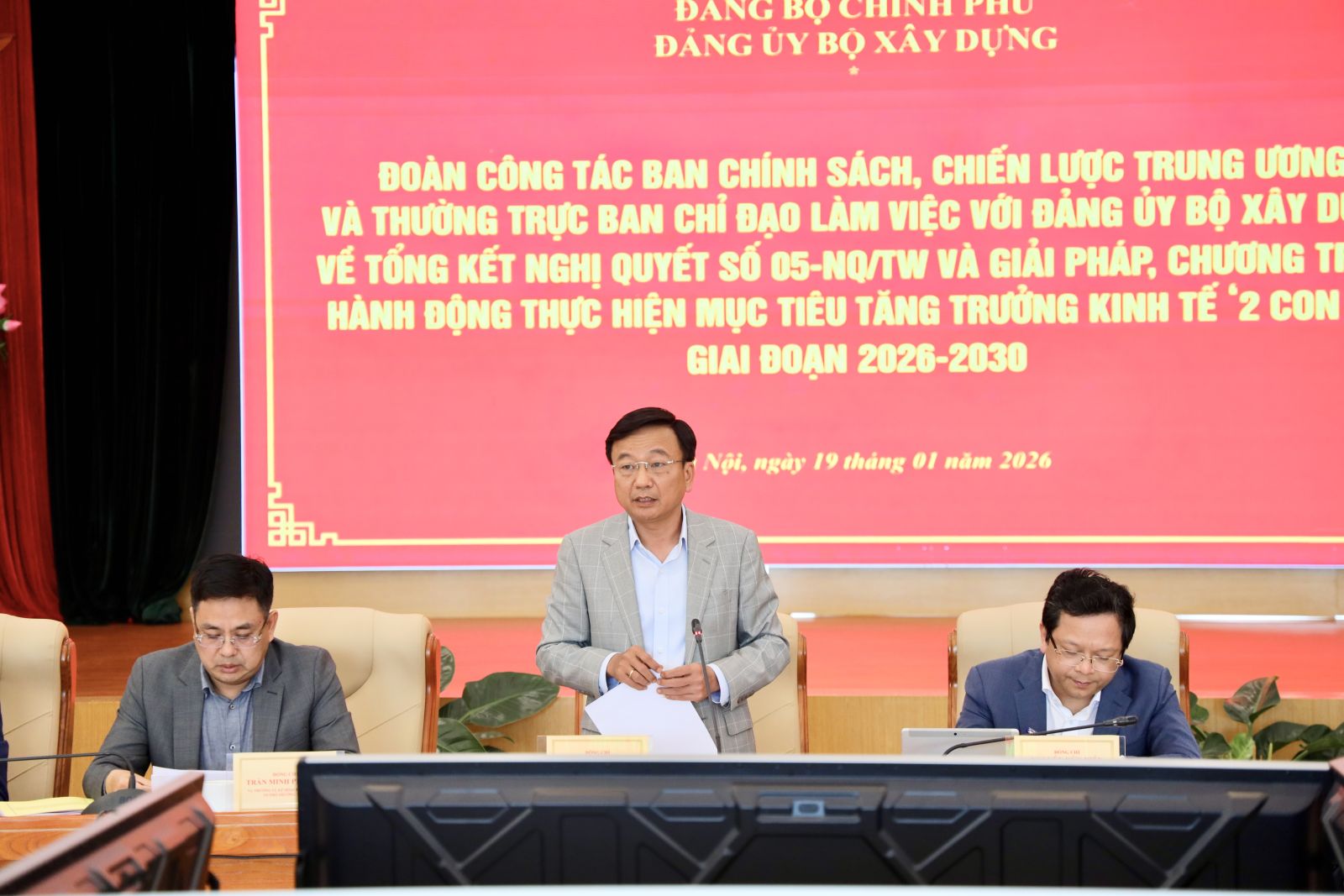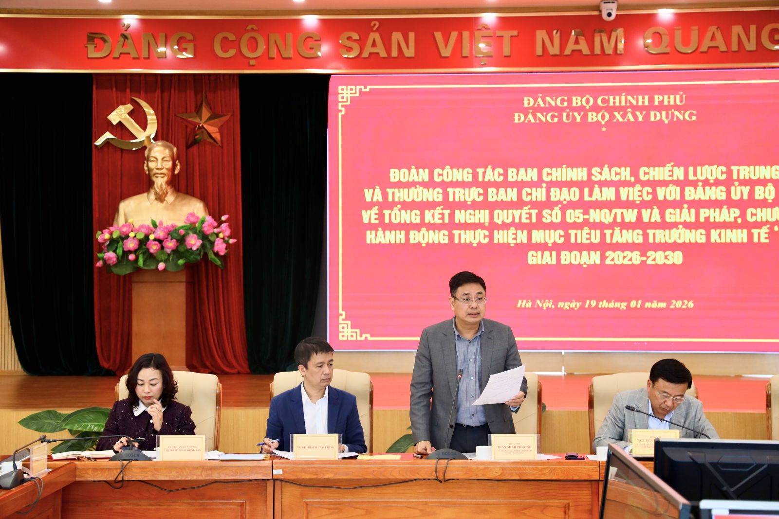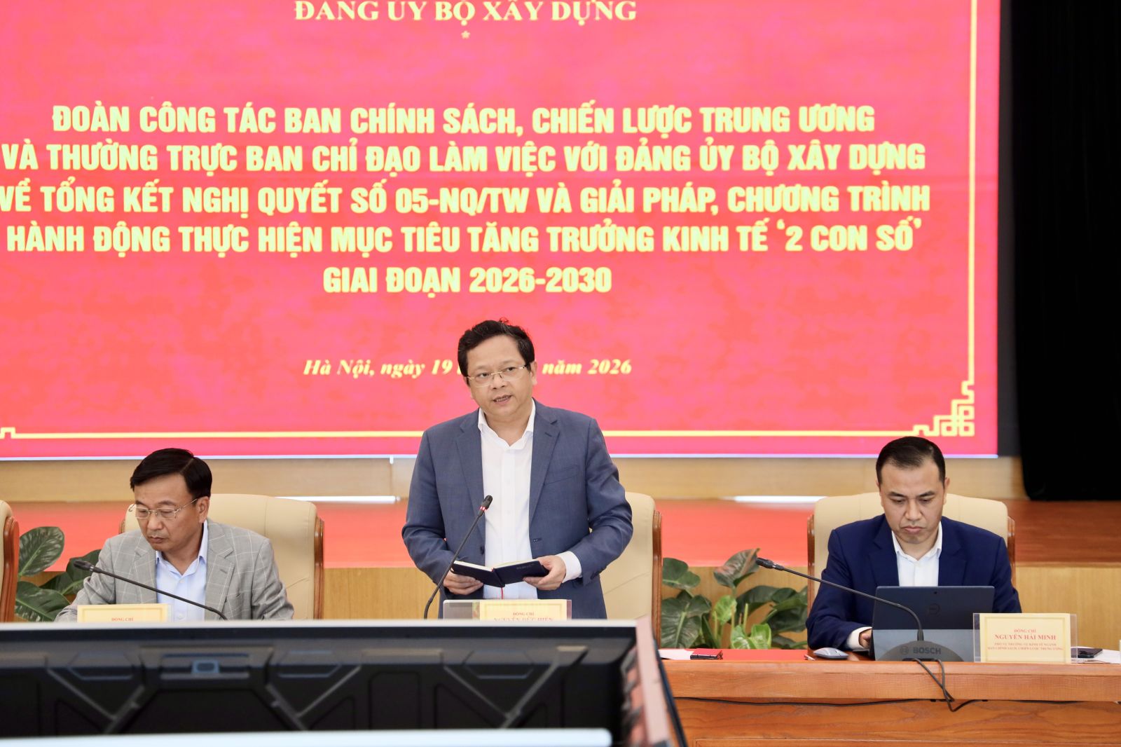 Phát biểu tại buổi làm việc, Thứ trưởng Bộ Xây dựng Nguyễn Danh Huy cho biết, Bộ Xây dựng nhận thức tầm quan trọng của công tác xây dựng Đề án và tổng kết Nghị quyết số 05-NQ/TW nên đã tích cực phối hợp với Ban Chính sách, chiến lược Trung ương trong công tác xây dựng Đề án và tổng kết Nghị quyết số 05-NQ/TW, tổ chức các phiên làm việc kỹ thuật với các đơn vị của bộ, khẩn trương hoàn thành dự thảo các văn bản để báo cáo với đoàn công tác. Thứ trưởng nhấn mạnh 03 vấn đề có tính chất nền tảng của ngành như: (1) Ngành xây dựng không chỉ là ngành kinh tế thuần túy mà là ngành kiến tạo không gian phát triển; (2) Những kết quả đạt được của ngành trong thời gian qua là rất quan trọng, đặc biệt là tăng trưởng của ngành đạt trên 9% năm 2025; (3) Các điểm nghẽn lớn nhất hiện nay vẫn nằm ở thể chế, quy hoạch và cơ chế huy động, phân bổ nguồn lực. Thứ trưởng Nguyễn Danh Huy đề nghị các vụ, cục của Bộ phát biểu vấn đề cần quan tâm theo yêu cầu của đoàn công tác; không chỉ là báo cáo kết quả mà còn phải đánh giá thẳng thắn những vấn đề vướng mắc, điểm nghẽn, thách thức để tháo gỡ, tạo đột phá về thể chế để đóng góp vào sự tăng trưởng kinh tế của đất nước.