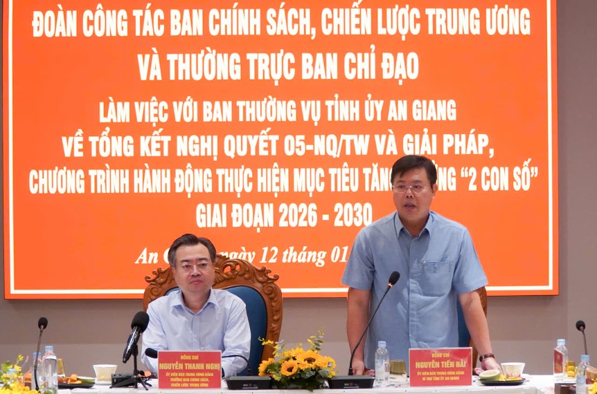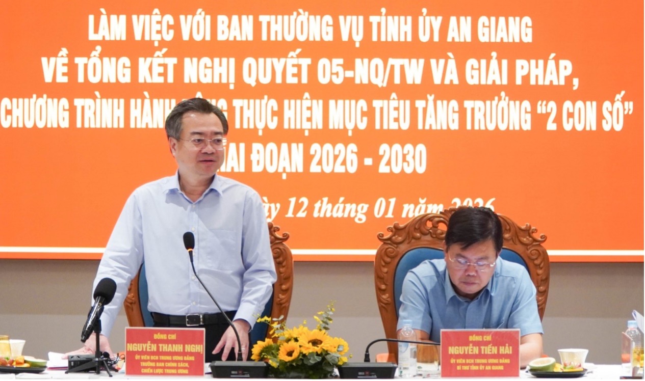 Kết luận buổi làm việc, đồng chí Trưởng Ban Chính sách, Chiến lược Trung ương Nguyễn Thanh Nghị đánh giá cao và chúc mừng những kết quả tỉnh đã đạt được trong quá trình lãnh đạo, chỉ đạo và triển khai thực hiện Nghị quyết số 05-NQ/TW và phát triển kinh tế -xã hội với quy mô nền kinh tế được mở rộng; cơ cấu kinh tế chuyển dịch đúng hướng, du lịch phục hồi và phát triển mạnh mẽ sau đại dịch. Để tỉnh đạt được mục tiêu tăng trưởng bình quân hàng năm trên 11% trong giai đoạn 2026-2030, đề nghị tỉnh làm tốt công tác quy hoạch trên cơ sở bám sát quy hoạch vùng và quốc gia; chuyển dịch cơ cấu kinh tế theo hướng hiện đại, bền vững, tập trung phát triển các ngành có tiềm năng, phát triển theo chiều sâu, ứng dụng công nghệ cao, quy mô lớn; tập trung hoàn thiện kết cấu hạ tầng chiến lược, tạo nền tảng phát triển dài hạn; thúc đẩy khoa học công nghệ, đổi mới sáng tạo và chuyển đổi số, tập trung ứng dụng, chuyển giao khoa học công nghệ trong các lĩnh vực kinh tế trọng điểm như du lịch, kinh tế biển, công nghệ sinh học; đẩy mạnh phát triển kinh tế biên mậu và kinh tế biển, đưa An Giang thành trung tâm kinh tế biển mạnh của quốc gia; quan tâm hơn nữa đến phát triển khu vực kinh tế tư nhân. Đối với đặc khu Phú Quốc, tỉnh cần đặc biệt nghiên cứu xây dựng các cơ chế, chính sách đặc thù, vượt trội hơn so với các đặc khu khác trong khu vực, đủ mạnh để đưa Phú Quốc thành cực tăng trưởng đột phá, lan tỏa cho cả tỉnh, cả vùng, đóng góp vào tăng trưởng chung của cả nước. Đồng thời, Ban Chính sách, chiến lược Trung ương sẽ tổng hợp các kiến nghị, mô hình hay, cách làm tốt và các dự án động lực của An Giang để đưa vào chương trình hành động của Nghị quyết Trung ương sắp tới.