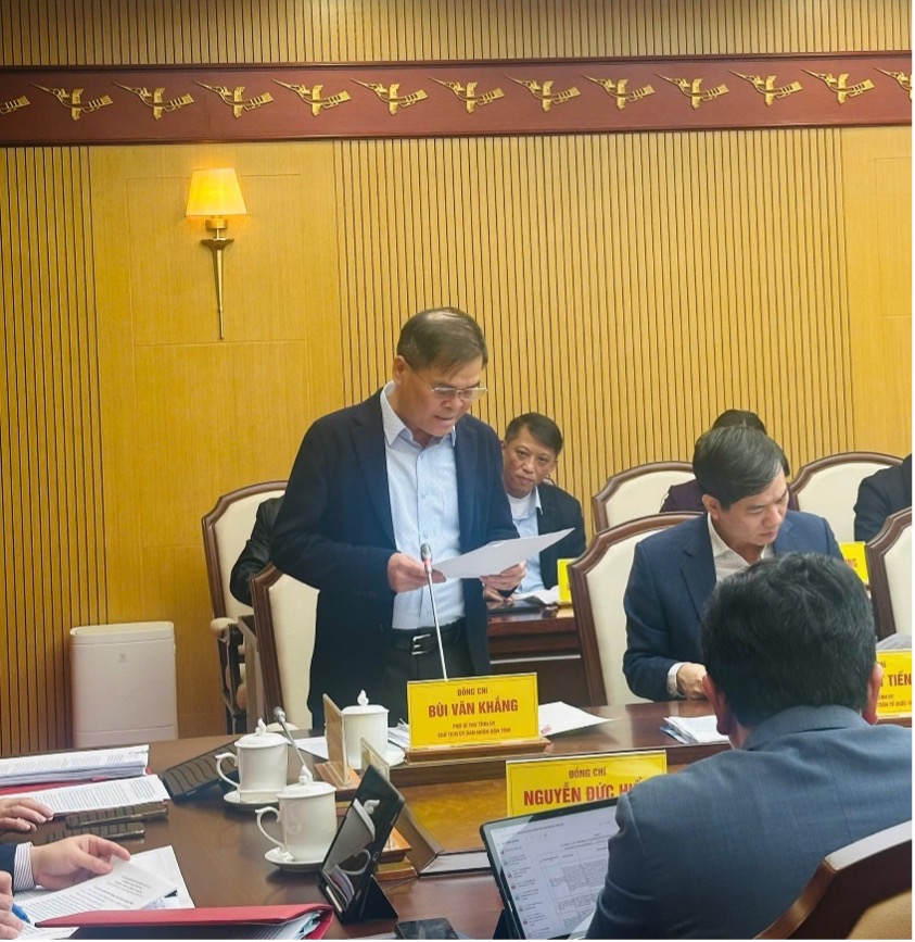 Đồng chí Bùi Văn Khắng, Phó Bí thư Tỉnh ủy, Chủ tịch UBND tỉnh báo cáo tại buổi làm việc