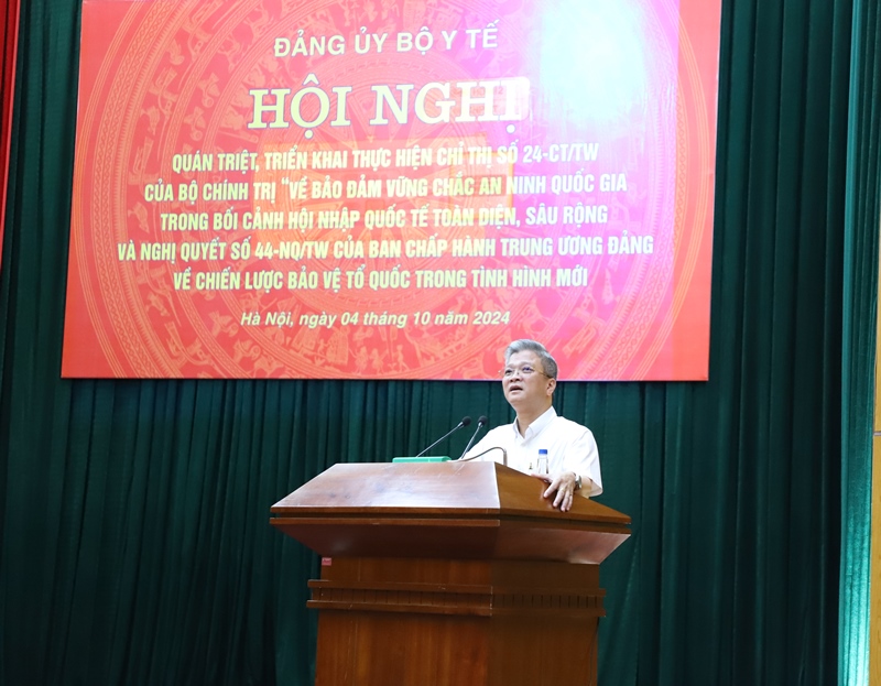 Ngày 04/10/2024, Đảng ủy Bộ Y tế tổ chức hội nghị triển khai thực hiện Chỉ thị 24-CT/TW ngày 13/7/2023 của Bộ Chính trị về đảm bảo vững chắc an ninh quốc gia trong bối cảnh hội nhập quốc tế toàn diện, sâu rộng và Nghị quyết số 44-NQ/TW ngày 24/11/2023 của Ban Chấp hành Trung ương Đảng về chiến lược bảo vệ Tổ quốc trong tình hình mới.
