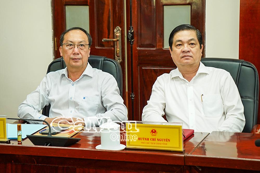 Phó Chủ tịch HĐND tỉnh Phan Hoàng Vũ; Phó Chủ tịch UBND tỉnh Huỳnh Chí Nguyện lắng nghe, tiếp thu ý kiến, kiến nghị của cử tri tại buổi tiếp xúc trực tuyến.