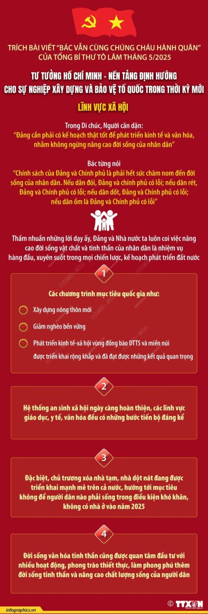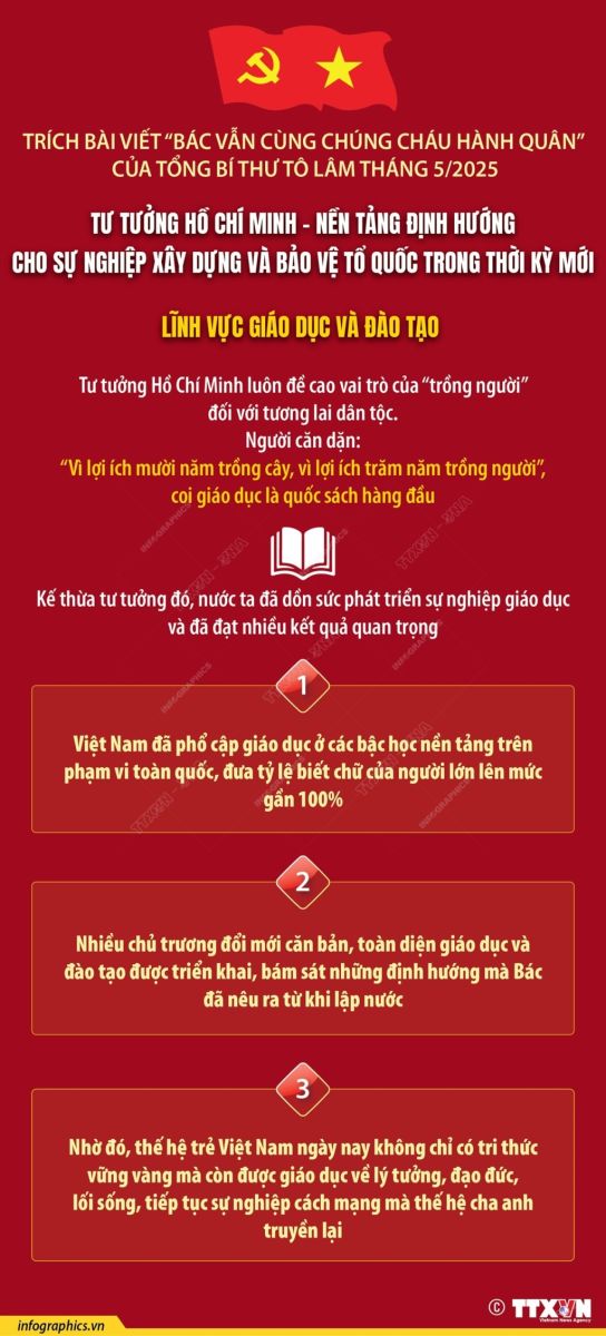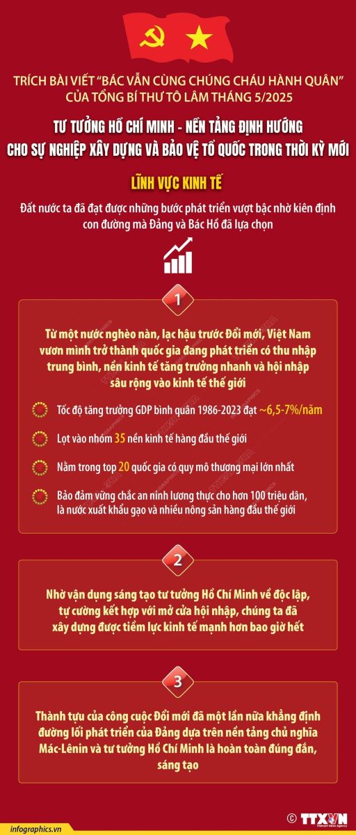 Trong bài viết “Bác vẫn cùng chúng cháu hành quân” tháng 5/2025, Tổng Bí thư Tô Lâm khẳng định: Hơn nửa thế kỷ từ khi Bác đi xa, tư tưởng và tấm gương của Chủ tịch Hồ Chí Minh tiếp tục soi đường, dẫn dắt dân tộc Việt Nam gặt hái nhiều thành tựu to lớn, có ý nghĩa lịch sử.