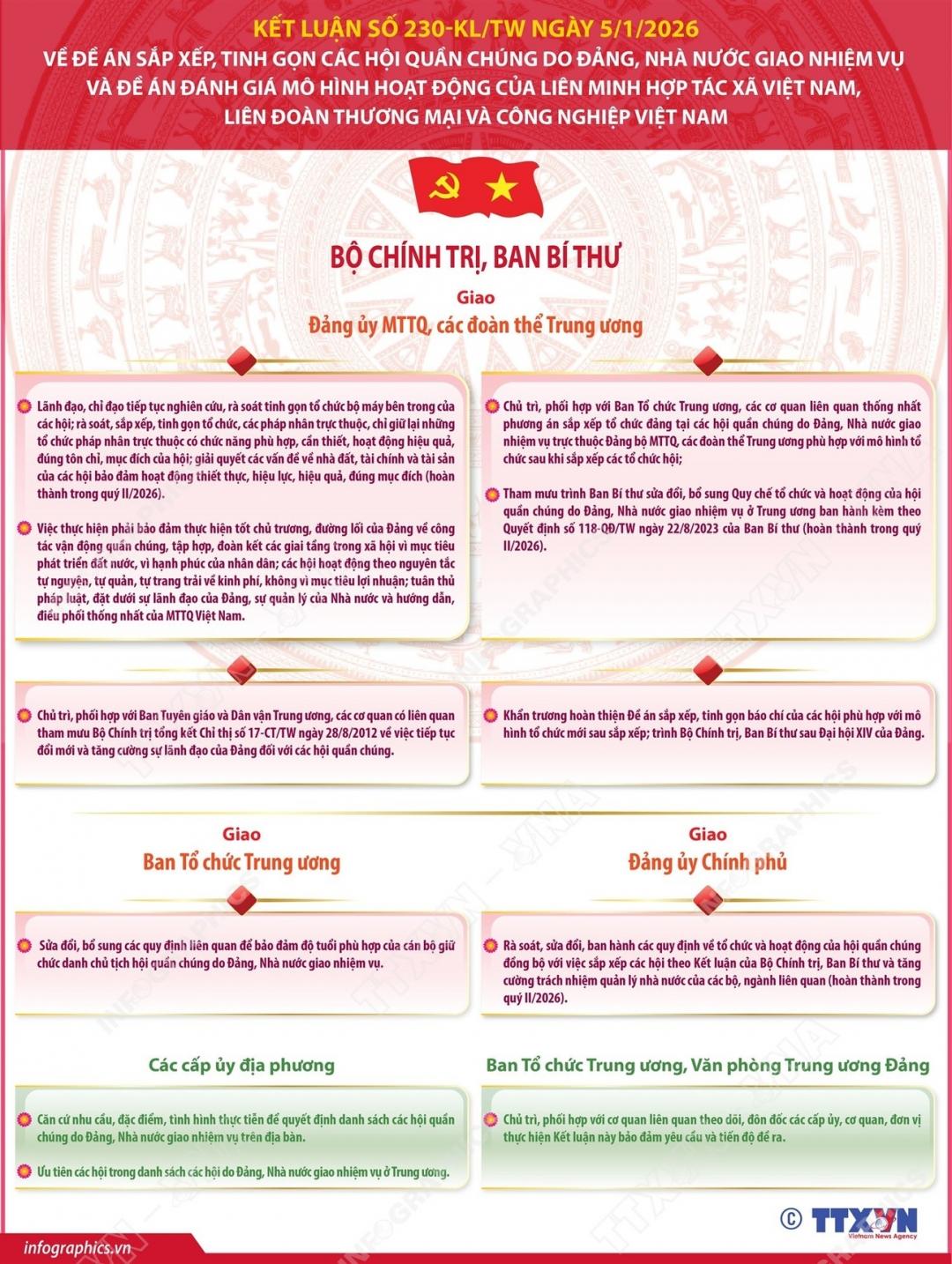 Bộ Chính trị, Ban Bí thư vừa ban hành Kết luận số 230-KL/TW, ngày 5/1/2026 về Đề án sắp xếp, tinh gọn các hội quần chúng do Đảng, Nhà nước giao nhiệm vụ và Đề án đánh giá mô hình hoạt động của Liên minh Hợp tác xã Việt Nam, Liên đoàn Thương mại và Công nghiệp Việt Nam.