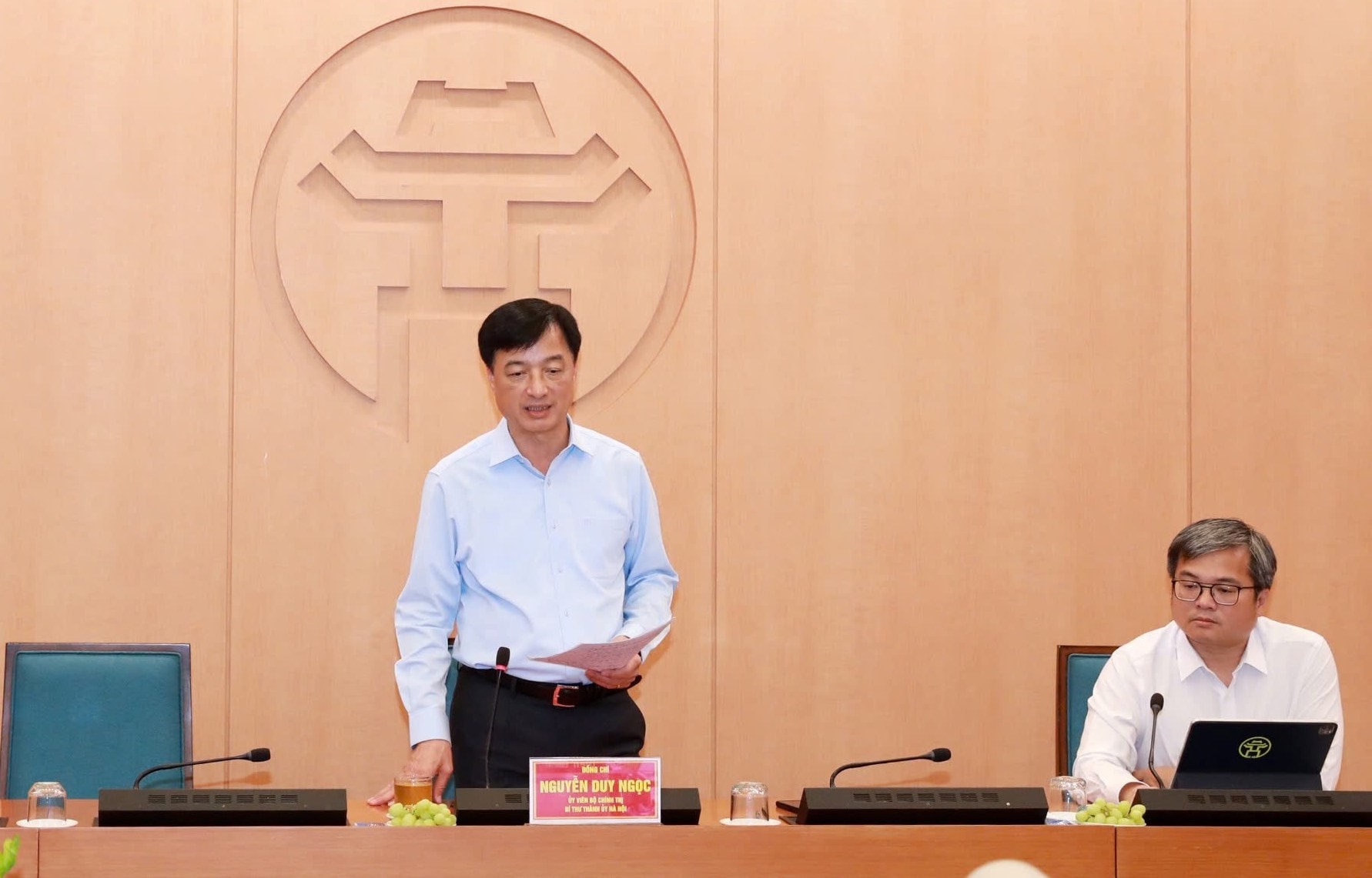 Ủy viên Bộ Chính trị, Bí thư Thành ủy Nguyễn Duy Ngọc phát biểu tại điểm cầu thành phố Hà Nội. Ảnh: Lê Kiên