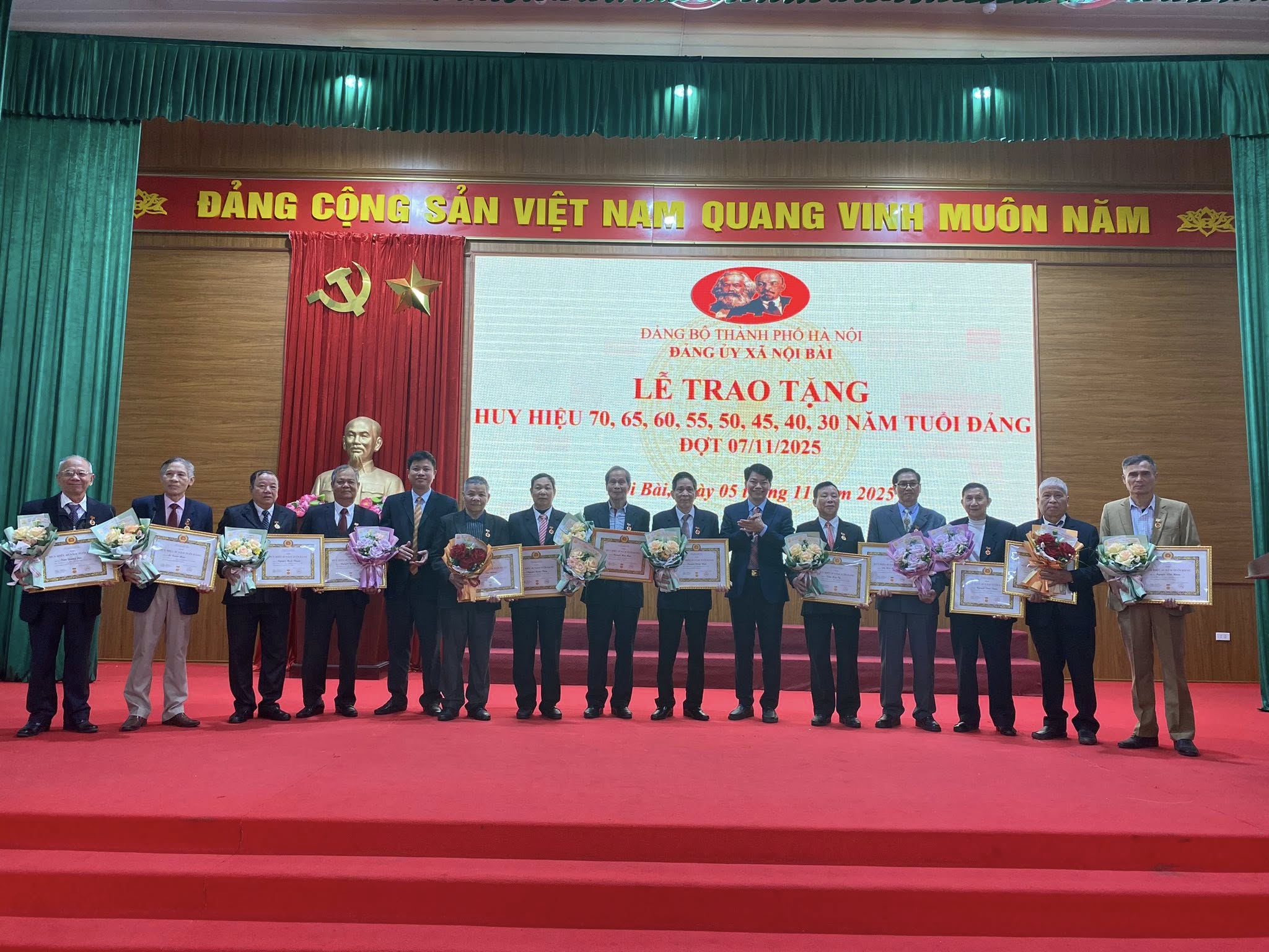 Tại buổi lễ, Bí thư Đảng ủy, Chủ tịch HĐND xã Nguyễn Nam Hà và Phó Bí thư Thường trực Đảng ủy xã Vi Thị Bình Anh đã gắn huy hiệu 70 năm tuổi Đảng, trao bằng công nhận và tặng hoa chúc mừng đồng chí Phù Thị Tự, sinh năm 1937, kết nạp đảng năm 1955, hiện đang sinh hoạt tại Chi bộ thôn Điền Xá, xã Nội Bài.