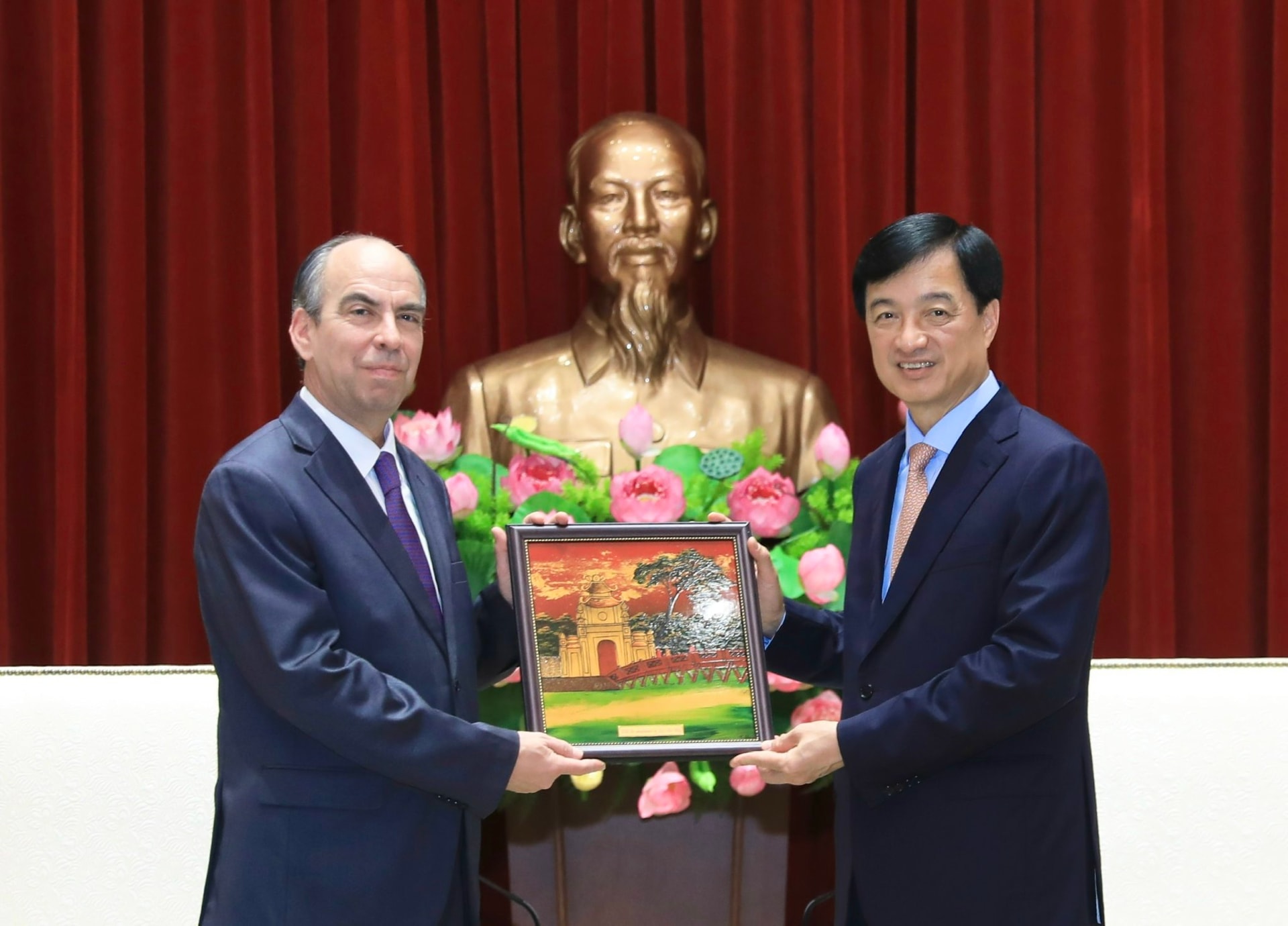 Ủy viên Bộ Chính trị, Bí thư Thành ủy Nguyễn Duy Ngọc trao quà lưu niệm của Thủ đô Hà Nội tặng Đại sứ Cuba Rogelio Polanco Fuentes