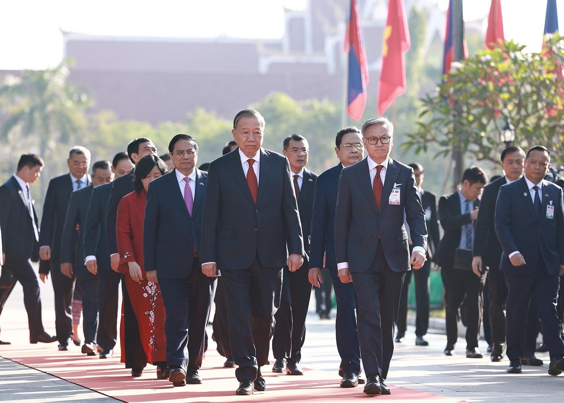 Tổng Bí thư Tô Lâm; Thủ tướng Phạm Minh Chính; Chủ tịch Quốc hội Trần Thanh Mẫn đến đặt vòng hoa tưởng niệm tại Đài tưởng niệm các chiến sĩ vô danh. (Ảnh: Dương Giang/TTXVN)