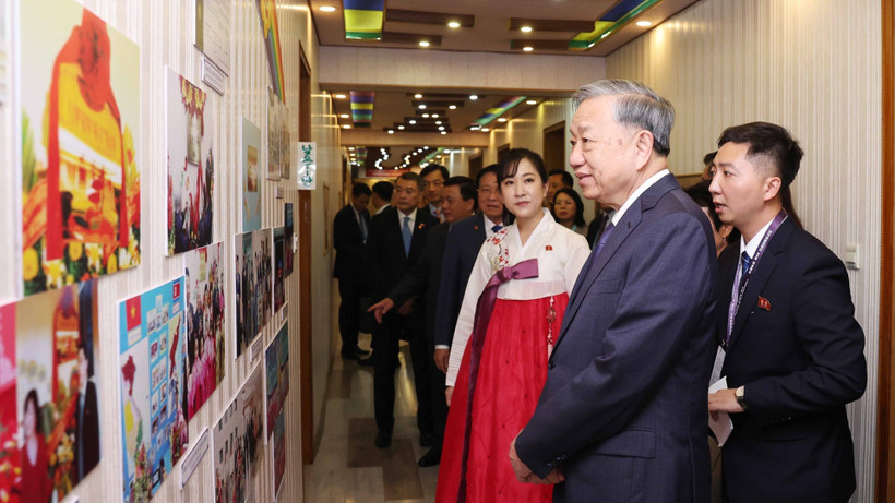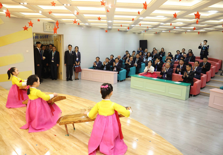 Tiếp tục chương trình thăm cấp Nhà nước tới Triều Tiên, chiều 9/10, tại Thủ đô Bình Nhưỡng, Tổng Bí thư Tô Lâm tới thăm Trường mẫu giáo Kiêng Sang và lớp học mang tên Chủ tịch Hồ Chí Minh.