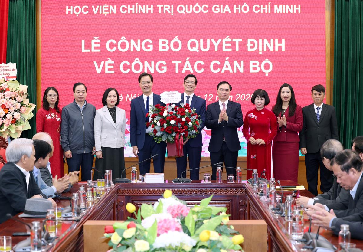 PGS,TS Dương Trung Ý, Phó Giám đốc Học viện Chính trị quốc gia Hồ Chí Minh trao Quyết định và tặng hoa chúc mừng PGS,TS Phạm Đức Kiên