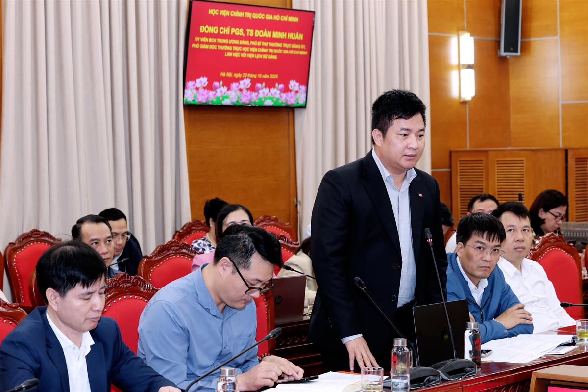 Phát biểu kết luận tại buổi làm việc, PGS,TS Đoàn Minh Huấn, Ủy viên Trung ương Đảng, Phó Giám đốc thường trực Học viện biểu dương, ghi nhận và đánh giá cao những kết quả mà Viện Lịch sử Đảng đã đạt được trong 5 năm qua. Viện đã khẳng định vị thế là đơn vị đầu ngành, trung tâm nghiên cứu, giảng dạy lịch sử Đảng uy tín hàng đầu trong hệ thống Học viện Chính trị quốc gia Hồ Chí Minh và trong cả nước. Viện đã xây dựng được đội ngũ cán bộ, giảng viên đoàn kết, ổn định, có bản lĩnh chính trị, trình độ chuyên môn cao, thể hiện tinh thần trách nhiệm và niềm đam mê khoa học. Công tác nghiên cứu khoa học và biên soạn lịch sử Đảng – từ lịch sử toàn Đảng đến lịch sử Đảng bộ các địa phương – đều có bước phát triển vượt bậc, góp phần quan trọng vào việc tổng kết thực tiễn, phát triển lý luận về Đảng Cộng sản Việt Nam, đặc biệt trong bối cảnh đổi mới và hội nhập quốc tế sâu rộng hiện nay.