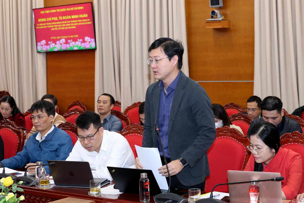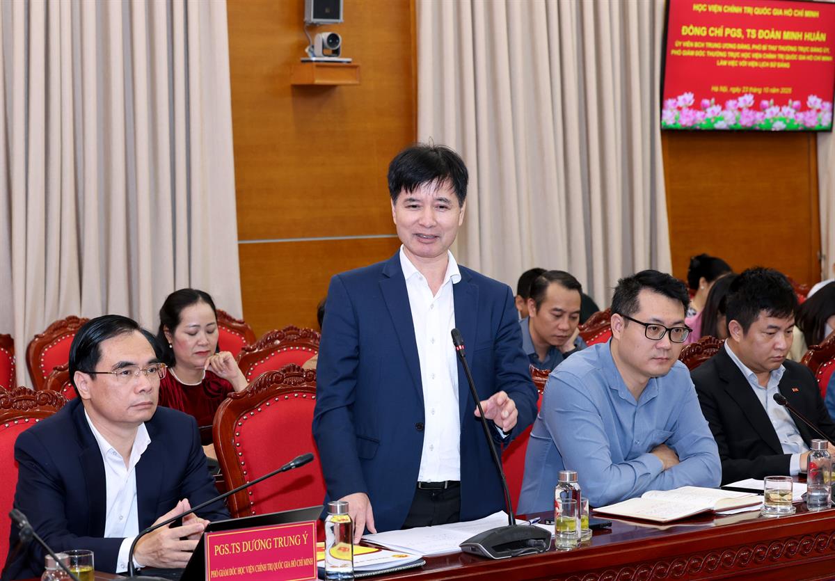 Phát biểu tại buổi làm việc, PGS,TS Dương Trung Ý, Phó Giám đốc Học viện bày tỏ vui mừng trước những kết quả toàn diện mà Viện Lịch sử Đảng đã đạt được trong giai đoạn 2020–2025. Đồng chí nhấn mạnh, Viện là đơn vị có truyền thống hơn 60 năm xây dựng và trưởng thành, luôn giữ vai trò nòng cốt trong nghiên cứu, giảng dạy và biên soạn lịch sử Đảng. Viện đã có nhiều đóng góp quan trọng trong việc tổng kết thực tiễn, phát triển lý luận về Đảng Cộng sản Việt Nam cầm quyền; đặc biệt là trong công tác tham mưu sơ kết, tổng kết Chỉ thị 20-CT/TW, hướng dẫn quy trình biên soạn lịch sử Đảng bộ các cấp, cũng như biên soạn và thẩm định nhiều công trình lịch sử có giá trị. Tạp chí Lịch sử Đảng tiếp tục khẳng định vị thế, uy tín của một tạp chí khoa học hàng đầu, đóng góp tích cực vào công tác tuyên truyền, giáo dục truyền thống cách mạng.
