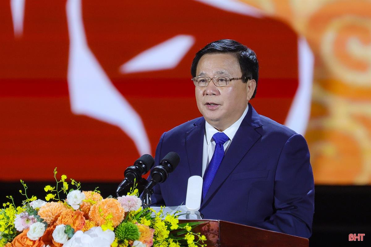 Đồngchí Bí thư Tỉnh ủy khẳng định, tiếp nối truyền thống vẻ vang của quê hương Đại thi hào Nguyễn Du cùng các bậc danh nhân văn hóa, lãnh tụ cách mạng, Đảng bộ và Nhân dân Hà Tĩnh luôn nêu cao tinh thần trách nhiệm, đoàn kết, nỗ lực, vượt qua khó khăn, đạt được kết quả toàn diện trên các lĩnh vực. Công tác xây dựng Đảng, hệ thống chính trị đạt nhiều dấu ấn quan trọng; kinh tế, xã hội chuyển biến rõ nét; an sinh xã hội được bảo đảm, đời sống của Nhân dân ngày càng được nâng cao. Quốc phòng - an ninh và đối ngoại được tăng cường.