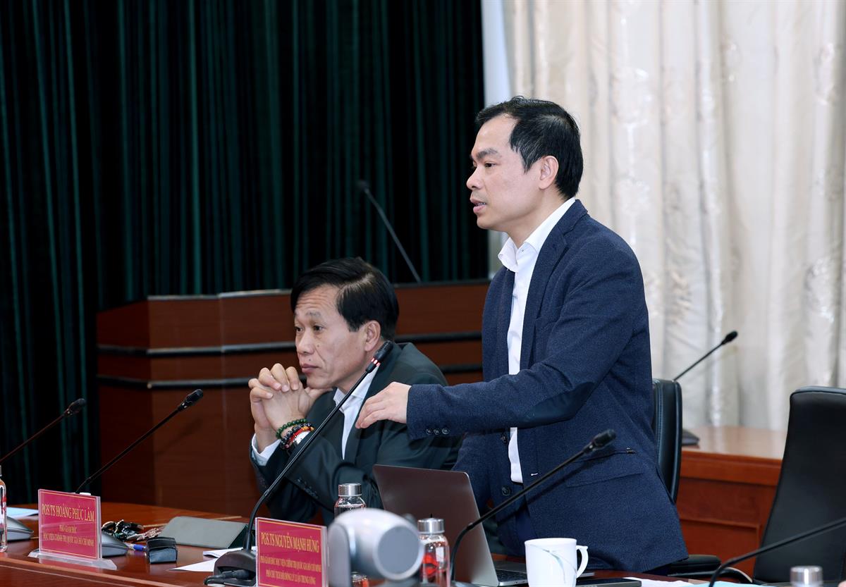 PGS,TS Nguyễn Mạnh Hùng, Phó Giám đốc Học viện, Phó Chủ tịch Hội đồng Lý luận Trung ương phát biểu ý kiến tại hội nghị _ảnh: Mạnh Thắng
