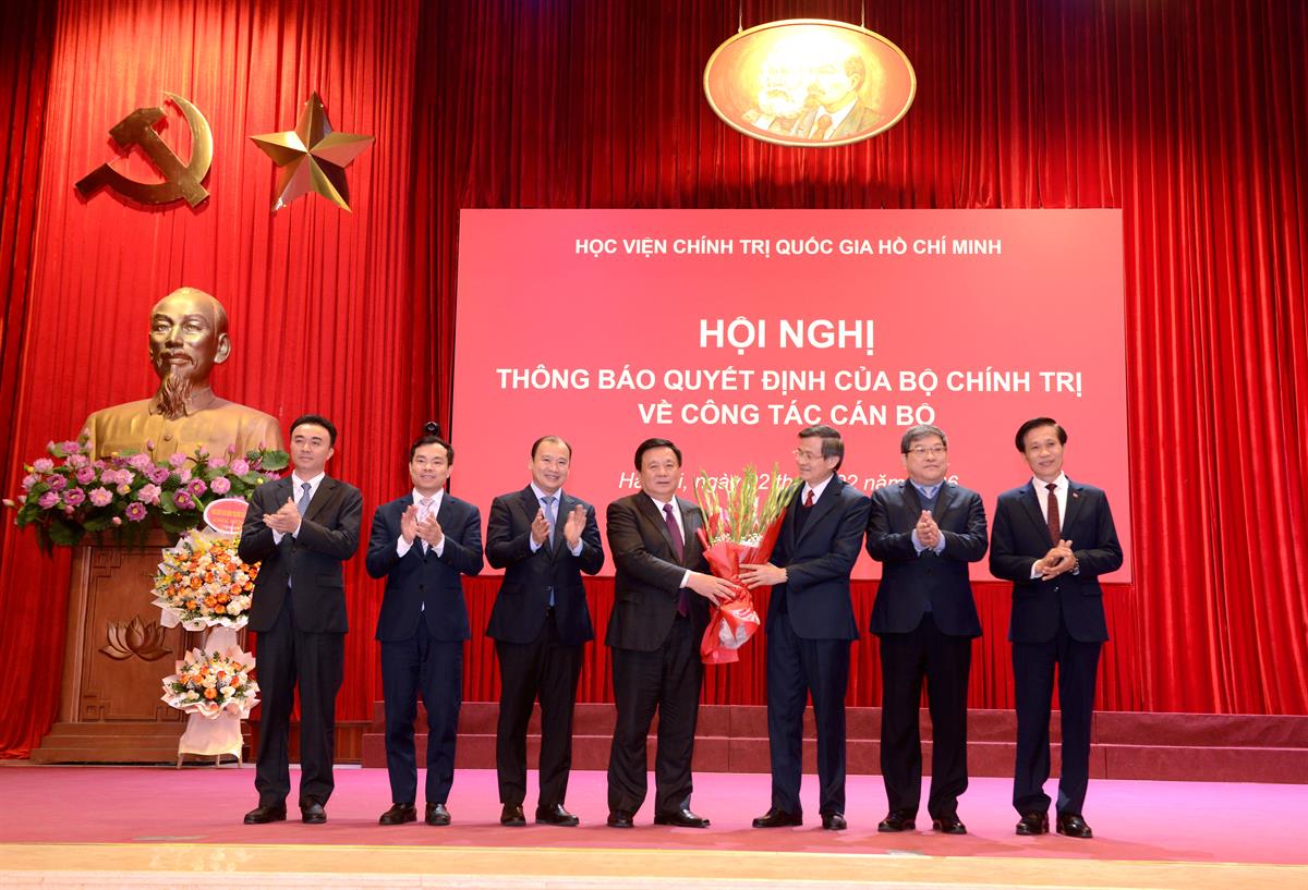 Thay mặt Đảng ủy, Ban Giám đốc, Thường trực Hội đồng Lý luận Trung ương cùng toàn thể viên chức, người lao động trong Học viện, Hội nghị trân trọng chúc mừng đồng chí Đoàn Minh Huấn trên cương vị công tác mới; tin tưởng đồng chí sẽ tiếp tục phát huy trí tuệ, bản lĩnh, tinh thần trách nhiệm, hoàn thành xuất sắc nhiệm vụ mà Đảng, Nhà nước và Nhân dân tin tưởng giao phó. Nhân dịp này, Hội nghị cũng trân trọng chúc mừng GS,TS Nguyễn Xuân Thắng, đồng thời bày tỏ lời cảm ơn sâu sắc và sự tri ân chân thành đối với những đóng góp to lớn, tâm huyết và trách nhiệm của đồng chí trong suốt quá trình lãnh đạo, chỉ đạo, xây dựng và phát triển Học viện.