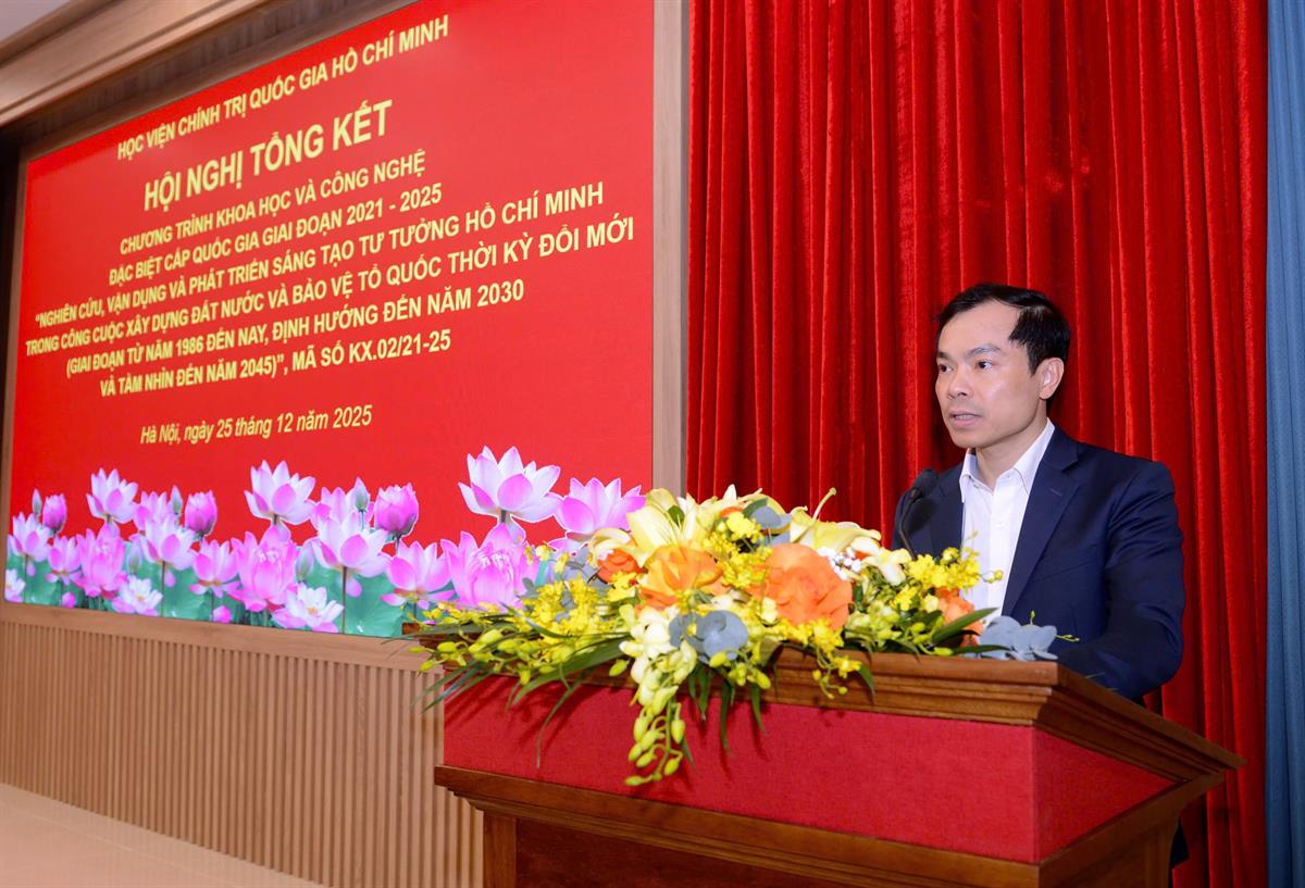 Báo cáo tóm tắt đánh giá kết quả thực hiện Chương trình, PGS,TS Nguyễn Mạnh Hùng, Phó Giám đốc Học viện Chính trị quốc gia Hồ Chí Minh, Phó Chủ tịch Hội đồng Lý luận Trung ương, Phó Chủ nhiệm Chương trình nhấn mạnh những đóng góp khoa học của Chương trình KX.02/21-25. Đồng chí cho biết, kết quả của Chương trình đã phân tích, làm rõ cơ sở lý luận và thực tiễn của việc nghiên cứu, vận dụng và phát triển sáng tạo tư tưởng Hồ Chí Minh trong công cuộc xây dựng, phát triển đất nước và bảo vệ Tổ quốc thời kỳ đổi mới; đồng thời nghiên cứu toàn diện, hệ thống và sâu sắc nội dung, tầm vóc, giá trị, ý nghĩa của tư tưởng Hồ Chí Minh.