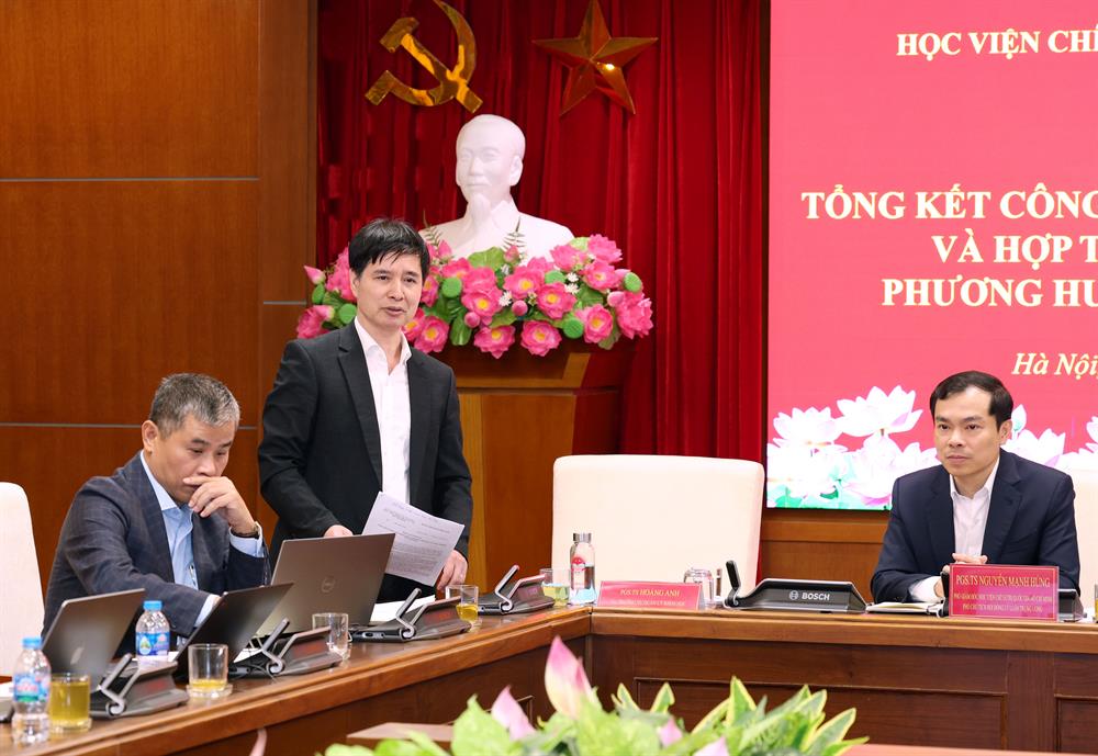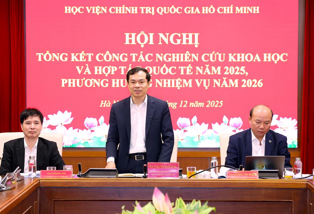 Phát biểu tại hội nghị, PGS,TS Nguyễn Mạnh Hùng, Phó Giám đốc Học viện, Phó Chủ tịch Hội đồng Lý luận Trung ương ghi nhận và chúc mừng những kết quả đạt được trong lĩnh vực quản lý khoa học và hợp tác quốc tế trong năm 2025.