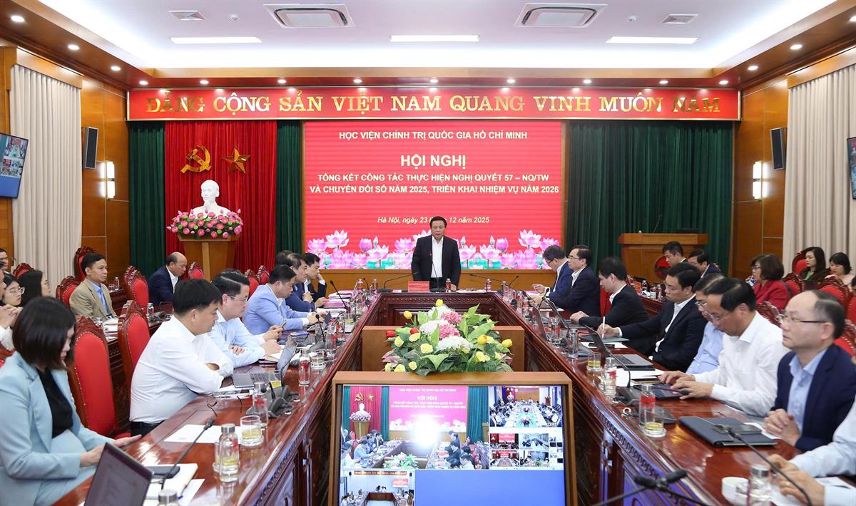 GS,TS Nguyễn Xuân Thắng cho biết, năm 2025 là năm đầu tiên toàn hệ thống Học viện triển khai Nghị quyết 57-NQ/TW. Xác định đây là nhiệm vụ chính trị trọng tâm, Đảng ủy Học viện đã ban hành Kế hoạch số 62-KH/ĐU ngày 20/5/2025 về thực hiện Nghị quyết 57-NQ/TW; Giám đốc Học viện đã thành lập Ban Chỉ đạo 57, ban hành Kế hoạch hành động số 1127-KH/HVCTQG ngày 16/10/2025 về thực hiện Nghị quyết 57-NQ/TW; hệ thống các thể chế, quy định quản lý nội bộ cũng đã cơ bản hoàn thiện, mô hình quản trị thông minh tại Học viện cũng được chính thức khai trương và đưa vào vận hành từ năm 2025, khởi động tiến trình chuyển đổi số toàn diện, phục vụ các mặt công tác của Học viện.