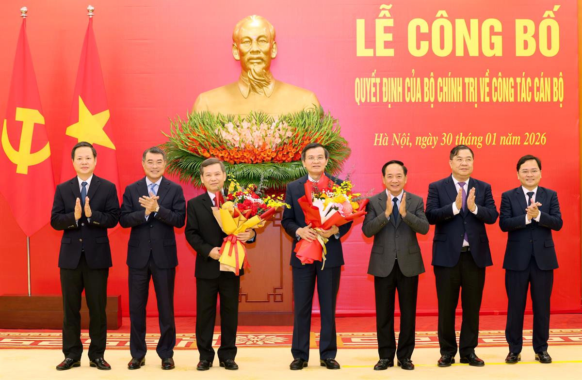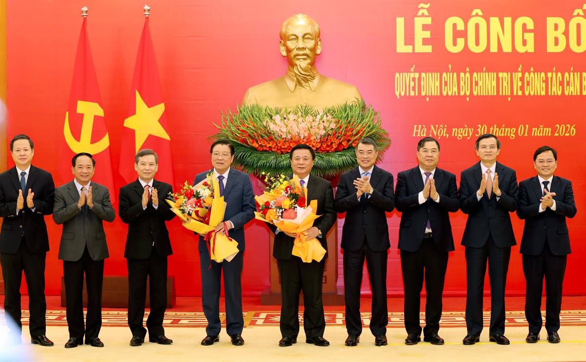 Tổng Bí thư Tô Lâm trao Quyết định và tặng hoa chúc mừng đồng chí Đoàn Minh Huấn và đồng chí Lê Minh Trí