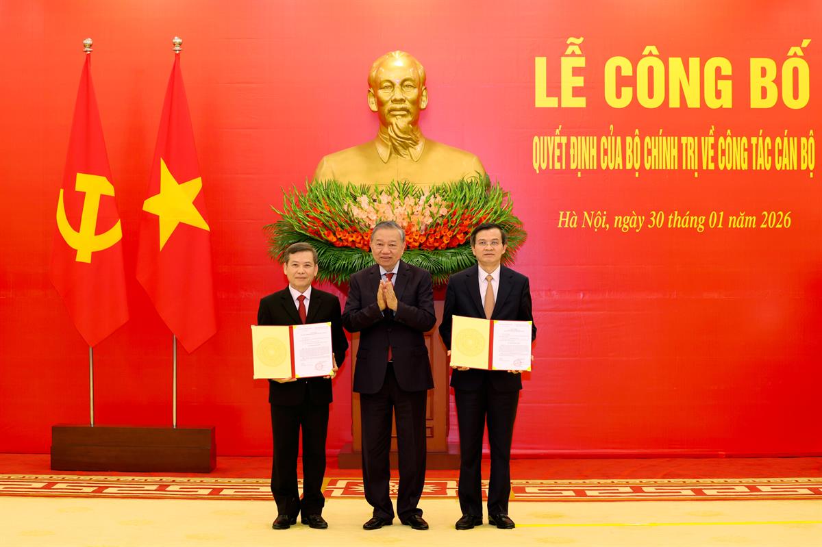 Tổng Bí thư Tô Lâm trao Quyết định chúc mừng đồng chí Đoàn Minh Huấn và đồng chí Lê Minh Trí