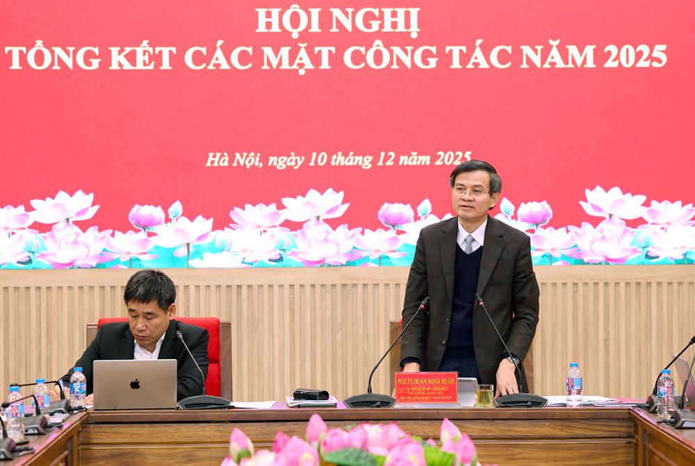 Trên cơ sở các báo cáo của Vụ, cùng những ý kiến thảo luận, tham góp tại hội nghị, PGS,TS Đoàn Minh Huấn, Ủy viên Trung ương Đảng, Phó Bí thư thường trực Đảng ủy, Phó Giám đốc thường trực Học viện thống nhất cao với báo cáo của Vụ Quản lý đào tạo, bồi dưỡng. Đánh giá những kết quả nổi bật mà Vụ đã đạt được trong năm 2025, PGS,TS Đoàn Minh Huấn nhấn mạnh rằng thành tích này phản ánh tổng hòa nhiều yếu tố, trong đó có vai trò tham mưu và giúp việc chủ động, hiệu quả của Vụ. Đồng chí khẳng định, kết quả ấy được thể hiện bằng “những con số biết nói” và nội dung phong phú trên nhiều lĩnh vực: từ công tác đào tạo, bồi dưỡng, linh hoạt thích ứng trong chuyển đổi quy chế, đến hoạt động bảo vệ nền tảng tư tưởng và phát triển các chương trình đào tạo, bồi dưỡng của Học viện. Điều này góp phần quan trọng trong việc nâng cao chất lượng quản lý, đổi mới nội dung chương trình và khẳng định vai trò nòng cốt của Vụ trong thực hiện nhiệm vụ chính trị của Học viện.