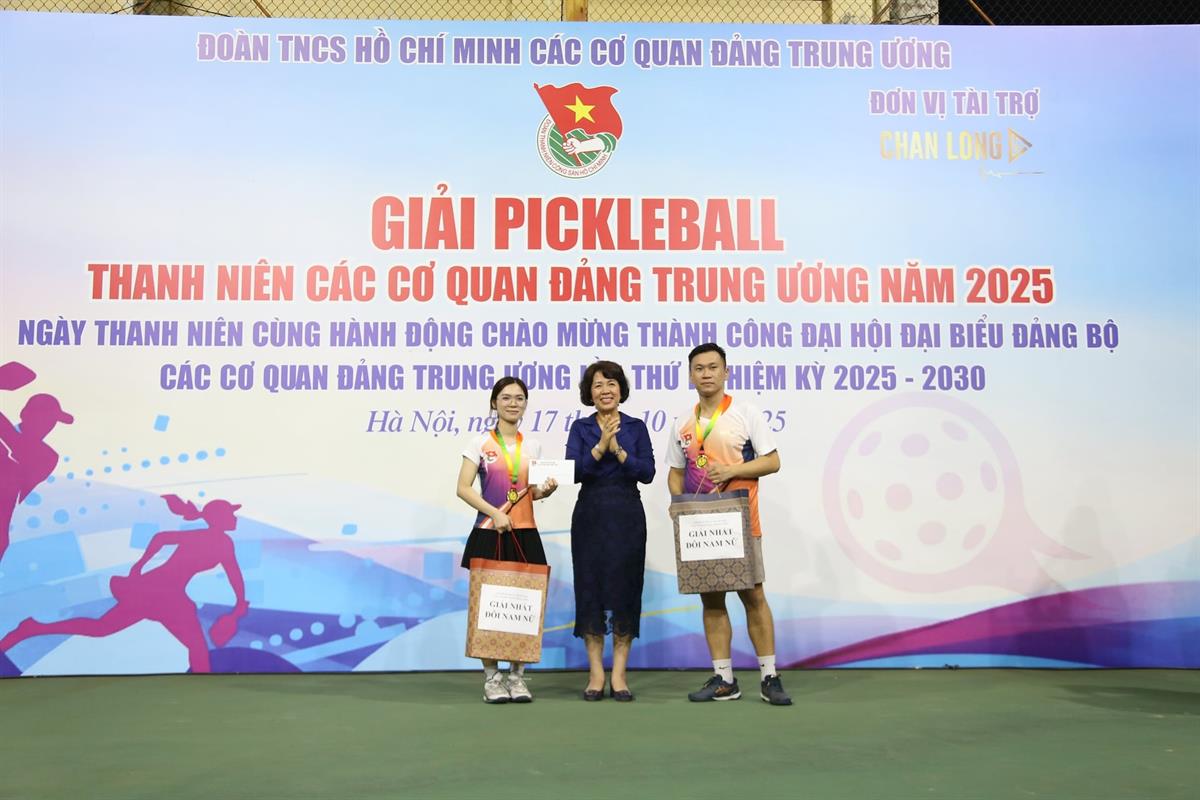 Đồng chí Trần Thị Ngọc Quỳnh, Bí thư Đoàn các cơ quan Đảng Trung ương trao giải Nhì nội dung Đôi Nam Nữ cho đội thi đấu của Đoàn Văn phòng Trung ương Đảng