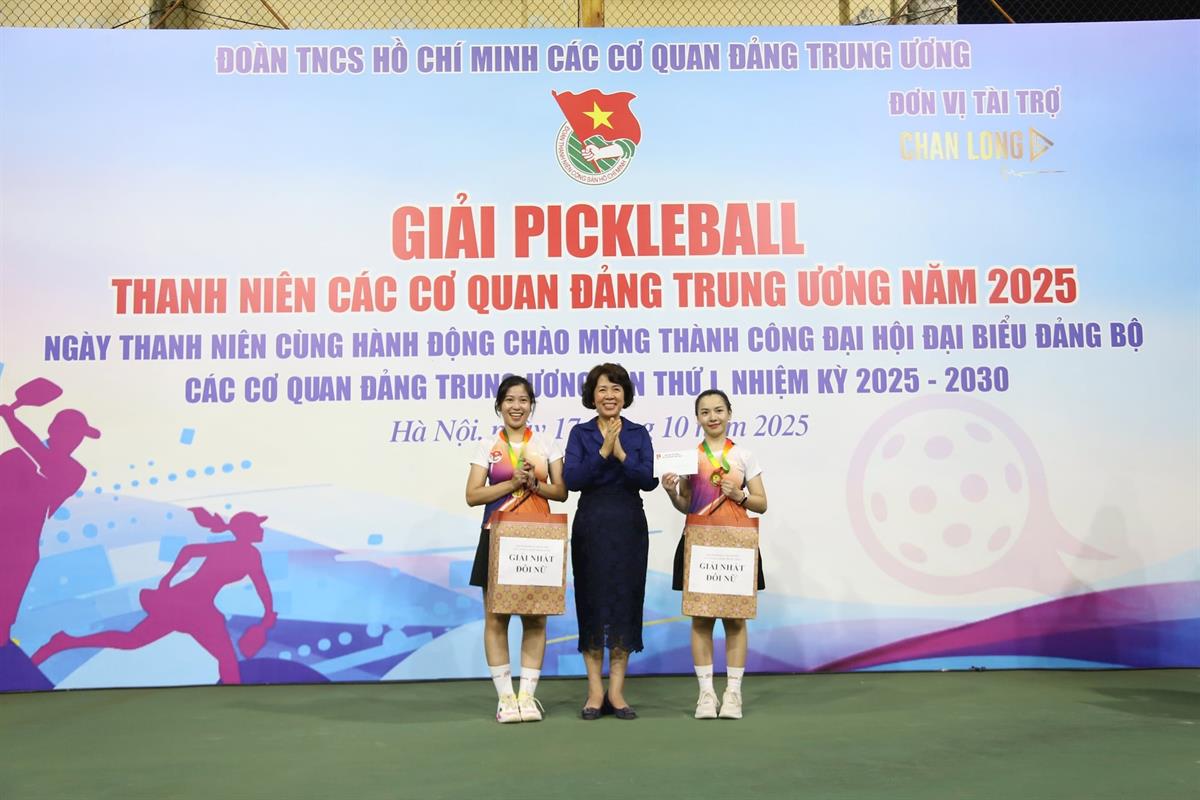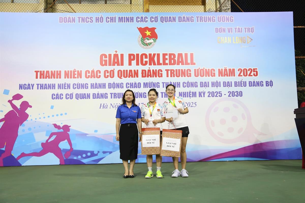 Đồng chí Trần Thị Ngọc Quỳnh, Bí thư Đoàn các cơ quan Đảng Trung ương trao giải Nhì nội dung Đôi Nữ cho đội thi đấu của Đoàn Học viện Chính trị quốc gia Hồ Chí Minh