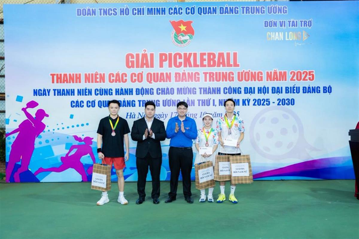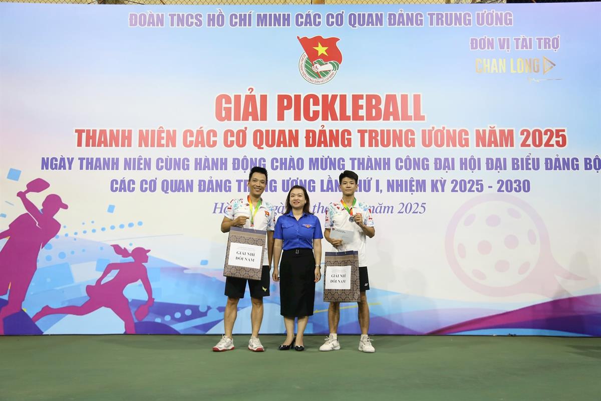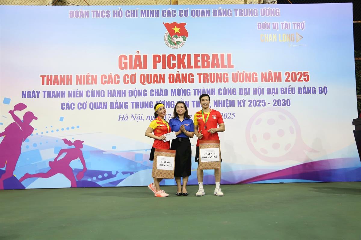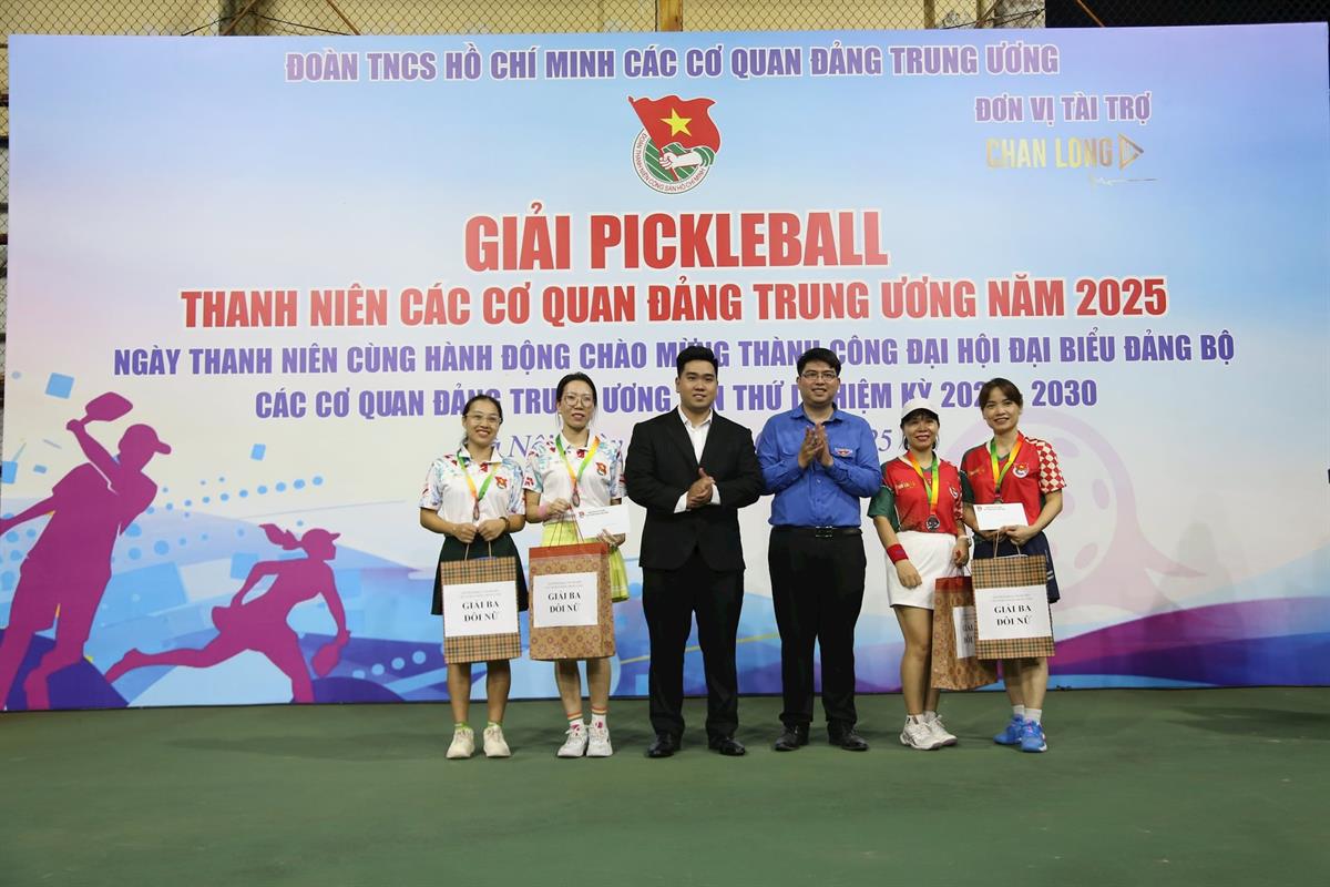 Đồng chí Nguyễn Xuân Khôi, Phó Bí thư, Chủ nhiệm Uỷ ban Kiểm tra Đoàn các cơ quan Đảng Trung ương và ông Nguyễn Văn Chương, Founder Công ty TNHH Chan Long Fitness, đại diện đơn vị tài trợ trao giải Ba nội dung Đôi Nữ cho các đội thi đấu của Đoàn Văn phòng Trung ương Đảng và Đoàn Học viện Chính trị quốc gia Hồ Chí Minh