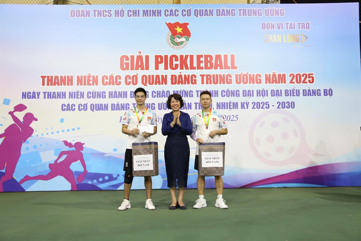 Đồng chí Nguyễn Thị Hoàng Vân, Phó Bí thư Đảng uỷ các cơ quan Đảng Trung ương trao giải Nhất nội dung Đôi Nam cho đội thi đấu của Đoàn Học viện Chính trị quốc gia Hồ Chí Minh