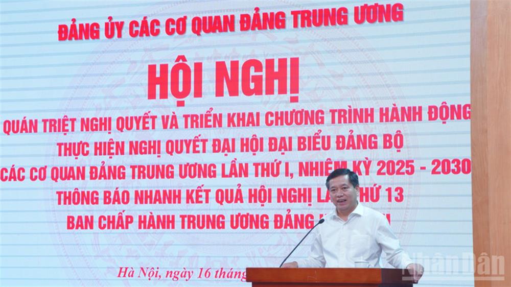 2.Cũng tại Hội nghị, thay mặt Ban Thường vụ Đảng ủy các cơ quan Đảng Trung ương, đồng chí Nguyễn Long Hải, Ủy viên dự khuyết Trung ương Đảng, Phó Bí thư Thường trực Đảng ủy các cơ quan Đảng Trung ương trình bày nội dung quán triệt, triển khai Nghị quyết, Chương trình hành động thực hiện Nghị quyết Đại hội đại biểu Đảng bộ các cơ quan Đảng Trung ương lần thứ I, nhiệm kỳ 2025-2030.
