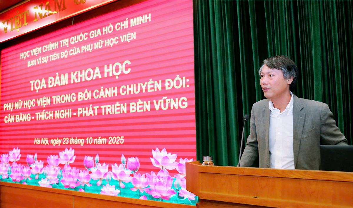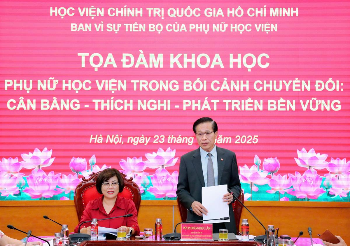 Phát biểu đề dẫn tọa đàm, PGS,TS Hoàng Phúc Lâm, Phó Bí thư Đảng ủy, Phó Giám đốc Học viện, Trưởng Ban Vì sự tiến bộ phụ nữ của Học viện cho rằng, Tọa đàm “Phụ nữ Học viện trong bối cảnh chuyển đổi: Cân bằng - Thích nghi - Phát triển bền vững” được xây dựng với chủ đề rất mới và hấp dẫn, nội dung có ý nghĩa và phù hợp với bối cảnh thực tiễn. Đây không chỉ là diễn đàn học thuật để nhận diện và phân tích những tác động đa chiều của quá trình chuyển đổi, mà quan trọng hơn là để khơi dậy tinh thần chủ động, sáng tạo, khát vọng hoàn thiện bản thân của đội ngũ cán bộ nữ Học viện; góp phần lan tỏa hình ảnh người phụ nữ Học viện hiện đại - tự tin, bản lĩnh, chuyên nghiệp và nhân văn.