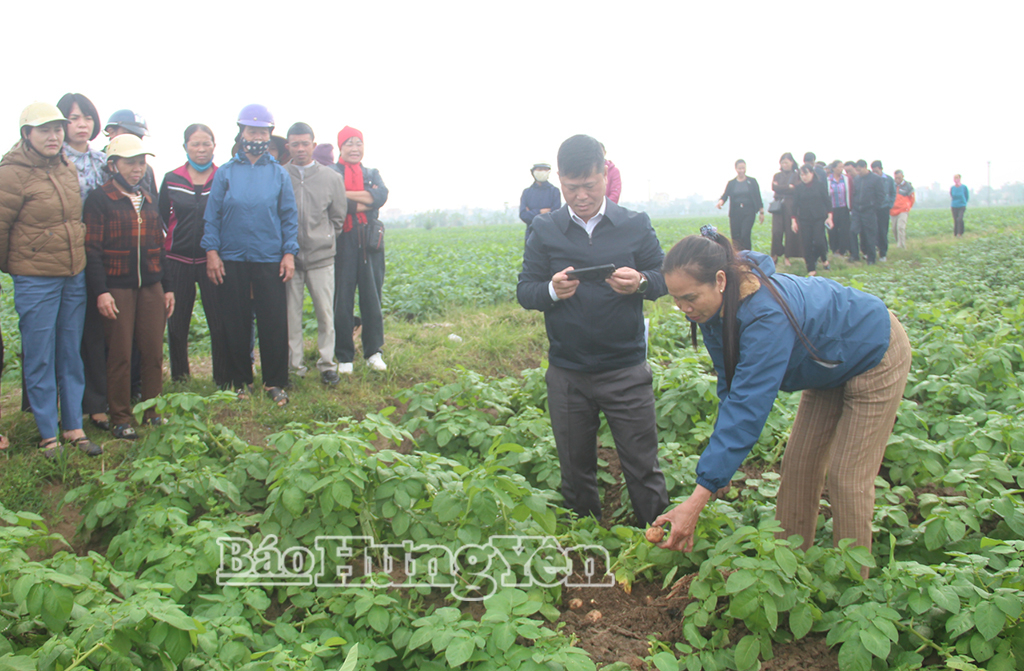 Các đại biểu thăm cánh đồng trồng khoai tây của thành viên HTX SXKD DVNN Vũ An (xã Vũ Quý).