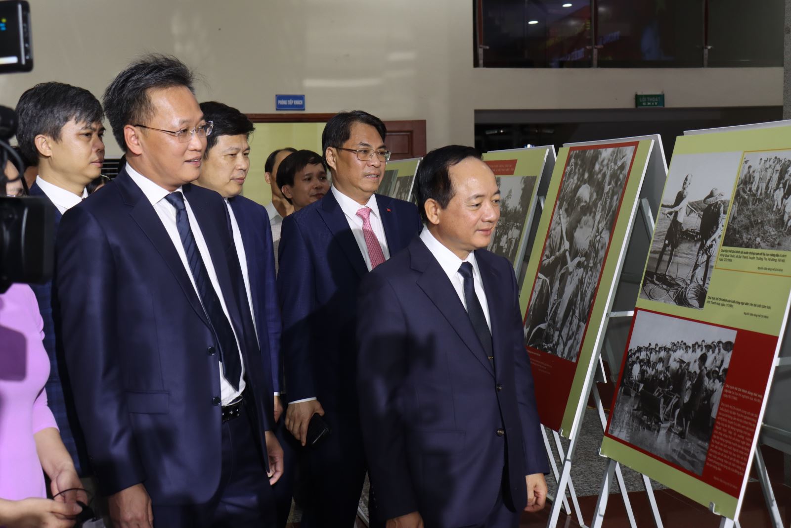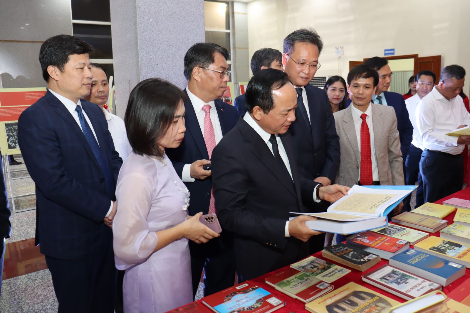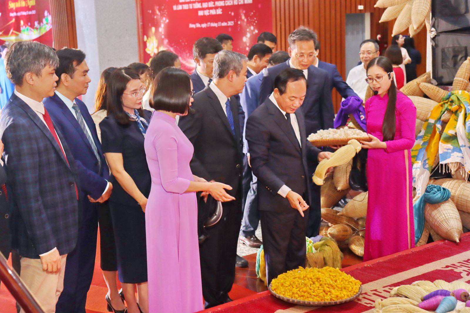 Đồng chí Trịnh Văn Quyết và các đại biểu tham quan gian trưng bày sản phẩm, mô hình đặc biệt của tỉnh Hưng Yên phục vụ chương trình