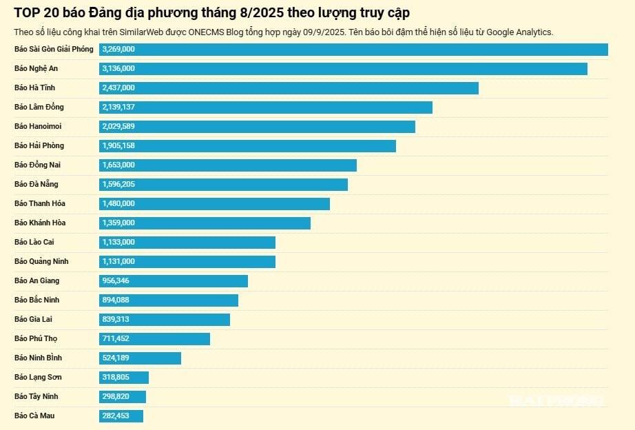 CTTĐT - Theo số liệu công khai trên SimilarWeb được ONECMS Blog tổng hợp ngày 09/9, Báo Lào Cai điện tử đứng thứ 11 trong các báo Đảng địa phương về lượng người truy cập tháng 8/2025.
