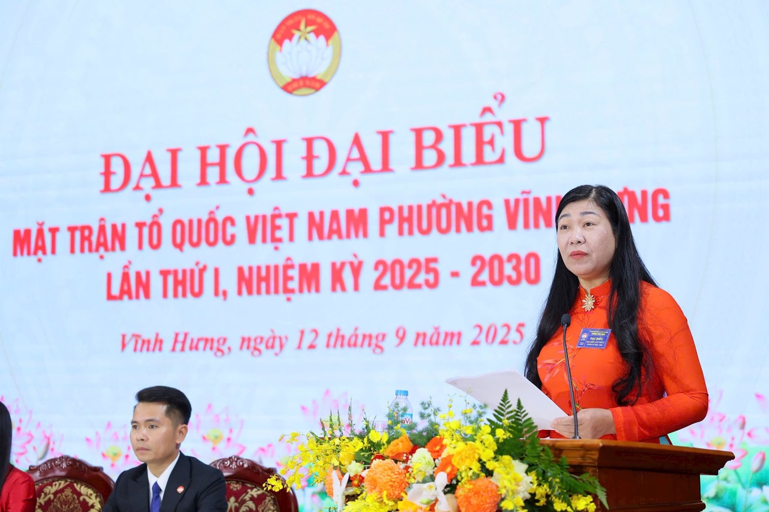 Tại Đại hội Ủy ban MTTQ Việt Nam phường Vĩnh Hưng lần thứ I, nhiệm kỳ 2025-2030, bà Nguyễn Lan Hương, Chủ tịch Ủy ban MTTQ Việt Nam thành phố Hà Nội đã biểu dương những kết quả nổi bật mà MTTQ phường Vĩnh Hưng đạt được trong nhiệm kỳ vừa qua.