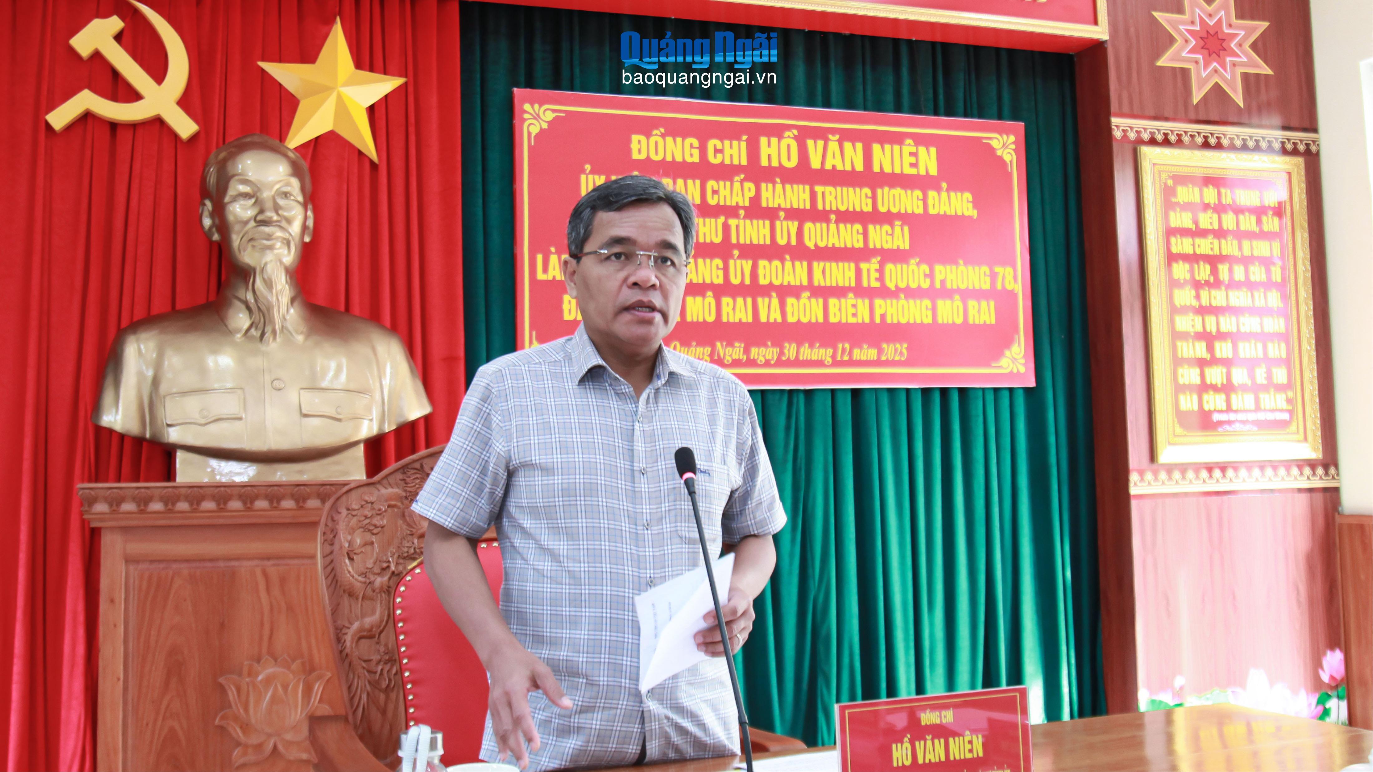 Phát biểu tại buổi làm việc, Ủy viên Trung ương Đảng, Bí thư Tỉnh ủy Hồ Văn Niên biểu dương tinh thần đoàn kết, nỗ lực vượt khó của Đảng bộ, chính quyền và Nhân dân xã Mô Rai trong giai đoạn đầu sau sáp nhập; ghi nhận những kết quả tích cực của Đảng ủy Đoàn KTQP 78 và các lực lượng đứng chân trên địa bàn trong thực hiện nhiệm vụ phát triển kinh tế, xã hội gắn với củng cố quốc phòng, an ninh khu vực biên giới.