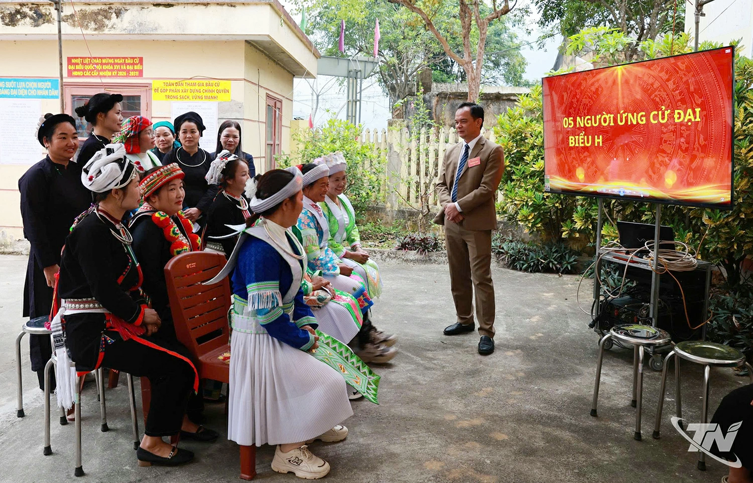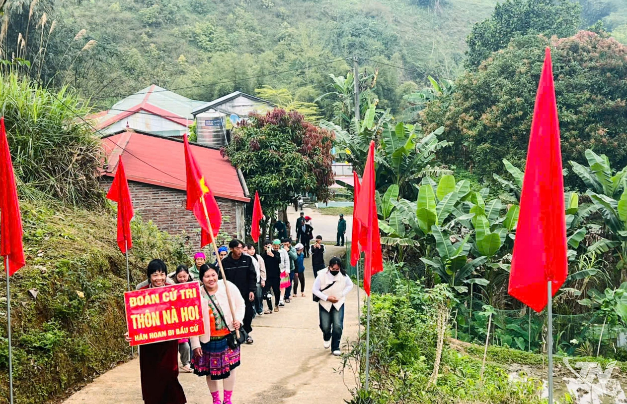 Đồng bào các dân tộc thiểu số trong những bộ trang phục truyền thống nhiều sắc màu nô nức đến điểm bỏ phiếu, tay cầm thẻ cử tri với niềm tự hào và trách nhiệm.