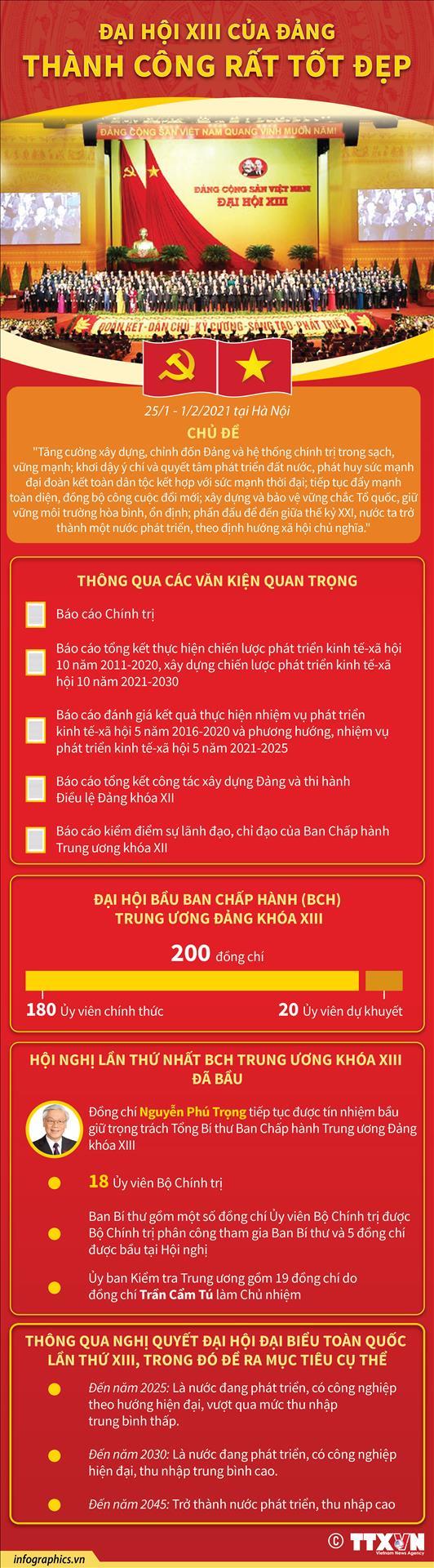 Đại hội bầu ra Ban Chấp hành Trung ương Đảng khoá mới gồm 200 đồng chí, trong đó 180 đồng chí Ủy viên chính thức, 20 đồng chí Ủy viên dự khuyết. Tại Hội nghị lần thứ nhất Ban Chấp hành Trung ương Đảng khóa XIII đã họp để bầu Bộ Chính trị, Ban Bí thư Trung ương Đảng, Ủy ban Kiểm tra Trung ương. Đồng chí Nguyễn Phú Trọng được tín nhiệm bầu tiếp tục giữ chức vụ Tổng Bí thư Ban Chấp hành Trung ương Đảng khóa XIII.