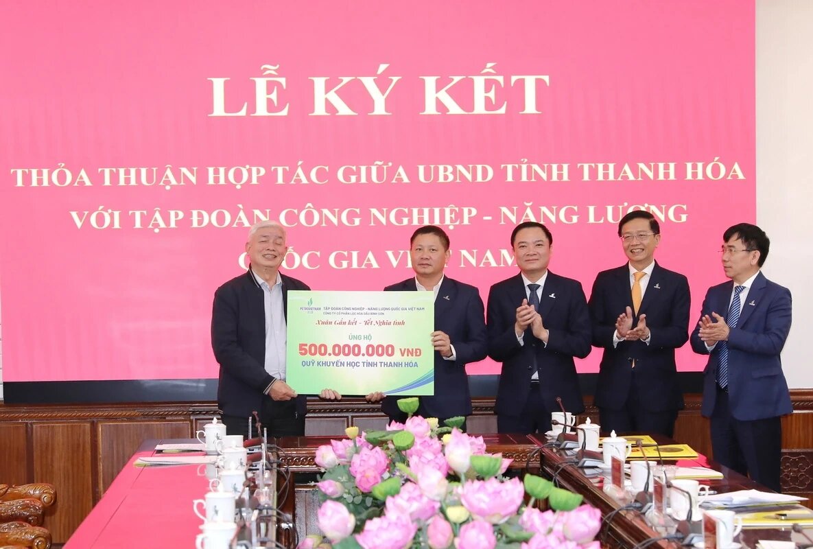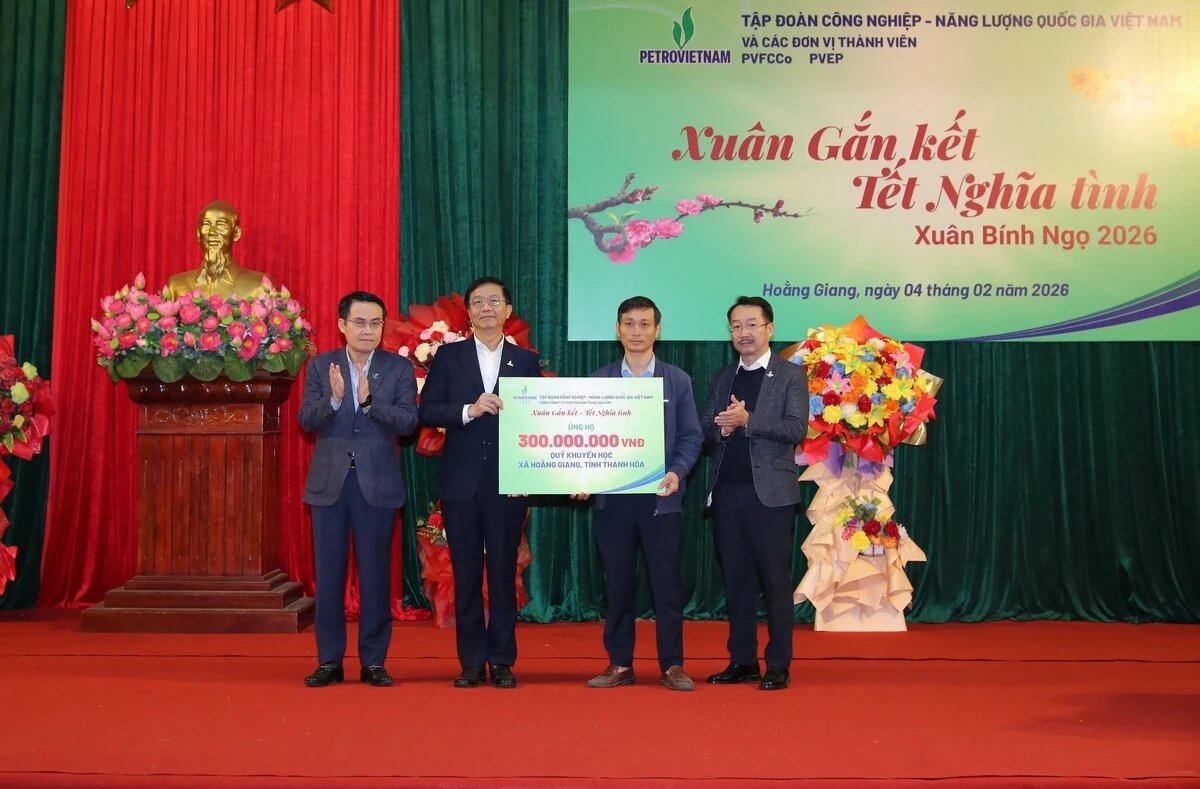 Nhân dịp này, Tập đoàn Công nghiệp - Năng lượng Quốc gia Việt Nam đã trao 5,1 tỷ đồng cho Ủy ban MTTQ Việt Nam tỉnh Thanh Hóa để ủng hộ chương trình “Tết vì người nghèo năm 2026” tỉnh Thanh Hóa; trao tặng học bổng trao cho 86 học sinh tỉnh Thanh Hóa đạt giải tại kỳ thi học sinh giỏi quốc gia; trao 500 triệu đồng cho Quỹ khuyến học tỉnh Thanh Hóa; trao 1,3 tỷ đồng ủng hộ chương trình “Tết vì người nghèo năm 2026” và 300 triệu đồng cho Quỹ khuyến học xã Hoằng Giang cùng nhiều phần quà cho các gia đình nghèo, hộ chính sách, học sinh nghèo học giỏi trên địa bàn.