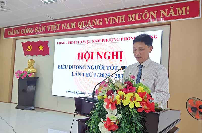 Phát biểu tại hội nghị, đồng chí Nguyễn Tuấn Anh - Bí thư Đảng ủy, Chủ tịch HĐND phường diểu dương những giá trị tốt đẹp của các tập thể, cá nhân tiêu biểu - những bông hoa tươi thắm trong vườn hoa thi đua yêu nước, những hạt nhân tích cực góp phần dựng xây quê hương Phong Quảng giàu đẹp, văn minh và phát triển bền vững. Đồng chí đề nghị trong thời gian tới tiếp tục đổi mới, nâng cao chất lượng phong trào thi đua yêu nước; Gắn phong trào với việc “Học tập và làm theo tư tưởng, đạo đức, phong cách Hồ Chí Minh” và thực hiện thắng lợi các mục tiêu, nhiệm vụ Nghị quyết Đại hội Đảng bộ phường lần thứ I đề ra. Phát hiện, bồi dưỡng, nhân rộng các gương điển hình tiên tiến, xây dựng phong trào trở thành động lực quan trọng thúc đẩy phát triển toàn diện; tạo môi trường, điều kiện thuận lợi cho phong trào thi đua người tốt, việc tốt phát triển. Tập trung phát huy sức mạnh đại đoàn kết toàn dân. Đưa phong trào “Người tốt, việc tốt” trở thành nếp sống đẹp của mỗi người dân Phong Quảng. Khơi dậy lòng tự hào, tinh thần trách nhiệm, khát vọng vươn lên để xây dựng quê hương ngày càng văn minh, giàu đẹp.