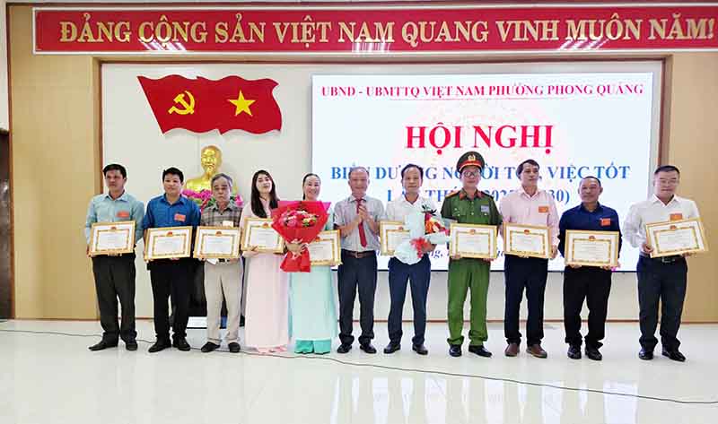Trong 5 năm qua (2020 - 2025), phong trào thi đua yêu nước ở phường Phong Quảng được triển khai đồng bộ, sâu rộng, tạo động lực quan trọng góp phần thực hiện thắng lợi các mục tiêu phát triển kinh tế - xã hội, đảm bảo quốc phòng - an ninh và xây dựng hệ thống chính trị vững mạnh. Kết quả nổi bật: Tỷ lệ hộ nghèo giảm còn 1,44%, hộ cận nghèo dưới 3%. Xây mới 2 nhà, sửa chữa 6 nhà với tổng kinh phí 280 triệu đồng; chi trả trợ cấp, hỗ trợ hộ nghèo đầy đủ, kịp thời. Huy động hơn 1.500 ngày công lao động và gần 1,5 tỷ đồng xã hội hóa để làm đường, nâng cấp hạ tầng dân sinh, chỉnh trang cảnh quan đô thị. Vận động trung bình 200 - 250 triệu đồng/năm, chăm lo thiết thực cho hộ khó khăn. Tổng cộng 315 lượt tập thể, cá nhân được khen thưởng, trong đó 50 tập thể, 150 cá nhân nhận giấy khen UBND phường; 85 cá nhân, 30 tập thể được đề nghị cấp trên khen. Tỷ lệ khen thưởng cho người lao động trực tiếp đạt khoảng 40%. Phong trào học tập và làm theo Bác: Hơn 40 cá nhân điển hình được biểu dương với các mô hình tiết kiệm, giúp đỡ người nghèo, lan tỏa trong cộng đồng. An ninh trật tự: Hàng trăm buổi tuyên truyền pháp luật được tổ chức; hàng nghìn lượt người tham gia tuần tra, diễn tập; duy trì hiệu quả các mô hình tự quản, không để phát sinh “điểm nóng” về an ninh.