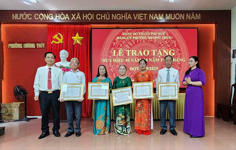 Tại buổi Lễ, đồng chí Trương Công Nghĩa - Trưởng Ban Xây dựng Đảng Đảng ủy phường đã công bố Quyết định của Ban Thường vụ Thành ủy tặng Huy hiệu Đảng đợt 2/9 cho 10 đảng viên thuộc Đảng bộ phường Hương Thủy. Theo Quyết định, có 5 đảng viên được trao tặng Huy hiệu 40 năm tuổi Đảng; 5 đảng viên được trao tặng Huy hiệu 30 năm tuổi Đảng.