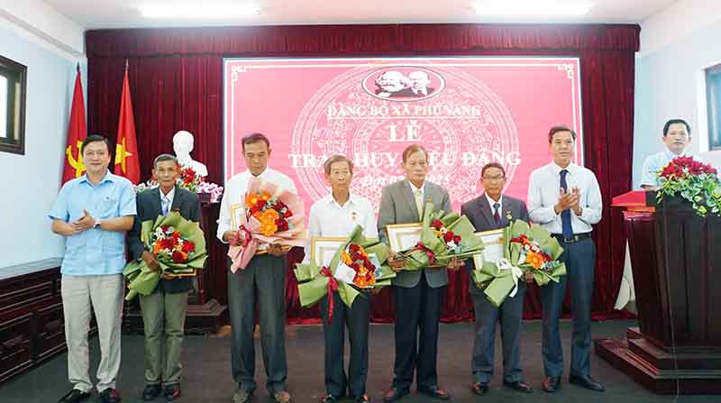 Lãnh đạo xã trao huy hiệu Đảng cho các đồng chí nhận huy hiệu 45 tuổi Đảng