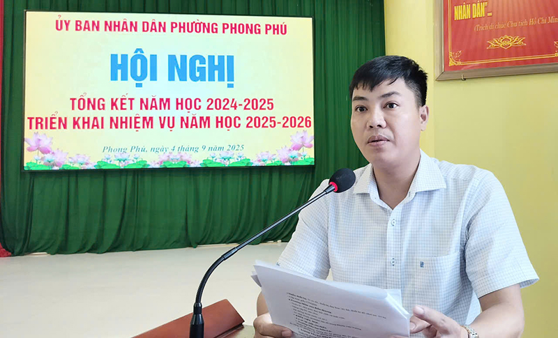 Phát biểu tại Hội nghị, đồng chí Phó Bí thư Thường trực Đảng ủy phường Nguyễn Ngọc Vũ cho biết: Năm học 2025 - 2026 là năm học đầu tiên phường Phong Phú cùng cả nước thực hiện mô hình theo chính quyền địa phương 02 cấp, cho nên thời gian tới ngành giáo dục phường Phong Phú cần tiếp tục thực hiện hiệu quả công tác quản lý nhà nước trong lĩnh vực giáo dục; đổi mới quản trị nhà trường; tiếp tục đổi mới, nâng cao chất lượng giáo dục mầm non, giáo dục phổ thông; nâng cao chất lượng công tác giáo dục chính trị, tư tưởng, giáo dục quốc phòng an ninh và giáo dục thể chất, y tế trường học; nâng trình độ chuẩn của đội ngũ giáo viên, cán bộ quản lý đáp ứng yêu cầu mới về phân cấp và đổi mới chương trình; huy động các nguồn lực đầu tư để tăng cường cơ sở vật chất và nâng cao chất lượng giáo dục, đào tạo; đẩy mạnh ứng dụng chuyển đổi số, công nghệ thông tin trong giáo dục,…. Đặc biệt, trước mắt các trường cần tập trung chuẩn bị các điều kiện để tổ chức thành công Lễ khai giảng năm học mới 2025 - 2026 đảm bảo trang trọng, ý nghĩa vào ngày 05/9/2025.