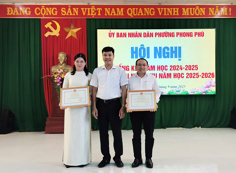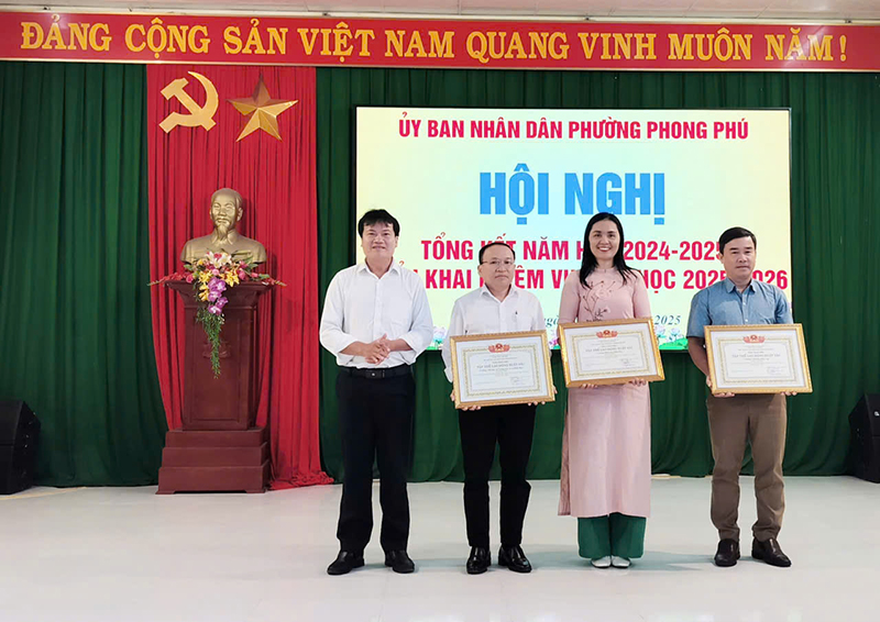 Tại Hội nghị, UBND phường đã trao tặng Bằng khen của Bộ Giáo dục và Đào tạo cho 02 tập thể và 02 cá nhân; Danh hiệu Tập thể lao động xuất sắc năm học 2024 - 2025 của Chủ tịch UBND thành phố cho 03 trường học và Bằng khen của Chủ tịch UBND thành phố cho 02 tập thể và 01 cá nhân đã có thành tích xuất sắc trong việc thực hiện nhiệm vụ công tác giáo dục và đào tạo năm học 2024-2025.