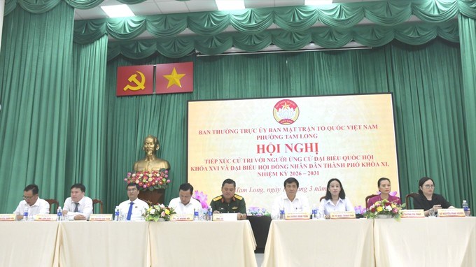 Các ứng cử viên ĐBQH khóa XVI và ĐB HĐND TPHCM nhiệm kỳ 2026-2031 tiếp xúc cử triNgày 10/3, Ban Thường trực Ủy ban MTTQ Việt Nam phường Tam Long (TPHCM) tổ chức hội nghị tiếp xúc cử tri với các ứng cử viên ĐBQH khóa XVI và ĐB HĐND TPHCM nhiệm kỳ 2026-2031.