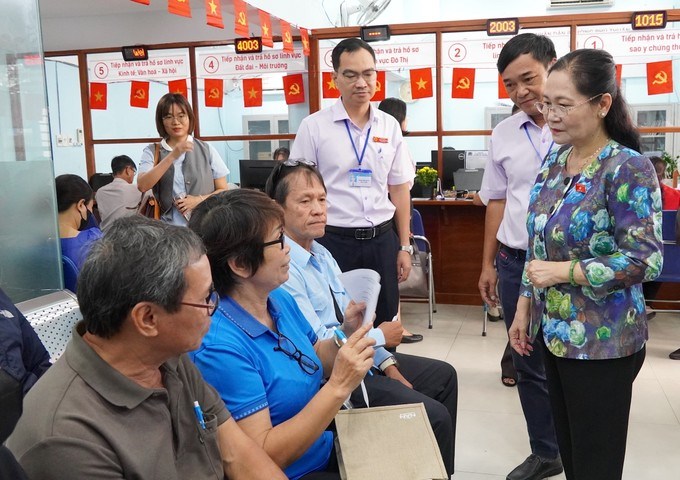 Đồng chí Nguyễn Thị Lệ trao đổi với người dân tại Trung tâm Phục vụ hành chính công phường Phú ThuậnNgày 9/9, Đoàn ĐBQH TPHCM - Đoàn công tác số 5, do đồng chí Nguyễn Thị Lệ, nguyên Phó Bí thư Thành ủy, nguyên Chủ tịch HĐND TPHCM làm trưởng đoàn, đã khảo sát công tác triển khai, tổ chức thực hiện chủ trương, quy định của Trung ương về chuyển đổi số; thực hiện Đề án 06; cải cách thủ tục hành chính liên thông toàn trình trực tuyến, phi địa giới hành chính; xây dựng chính quyền số, xã hội số và chức năng, nhiệm vụ, quyền hạn của chính quyền địa phương cấp xã trên địa bàn TPHCM tại phường Phú Thuận.