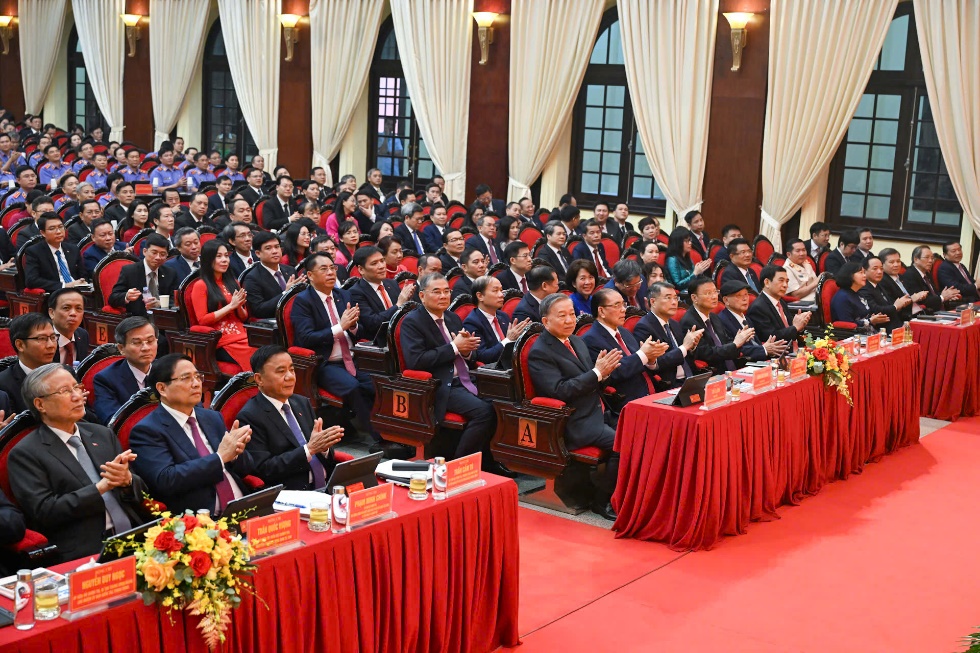 Tổng Bí thư Tô Lâm cùng các đồng chí lãnh đạo, nguyên lãnh đạo Đảng, Nhà nước và các đại biểu dự Đại hội.